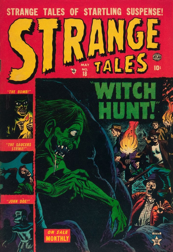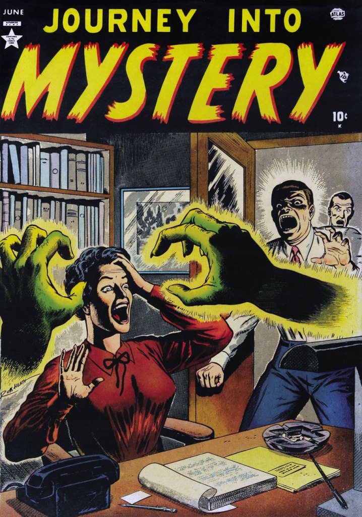 This is Marvel Tales no. 104 (Dec. 1951, Atlas); colours, in every case, by Stan Goldberg.This is Astonishing no. 9 (Feb. 1952, Atlas).This is Suspense no. 14 (Feb. 1952, Atlas). This one’s especially intriguing: there’s so much going on, yet it’s not overly busy… the mark of a first-rate cover designer.This is Journey into Mystery no. 1 (June 1952, Atlas). By now, I have a sneaking suspicion that Mr. Heath liked his ladies… on the buxom side.This is Adventures into Terror no. 11 (Aug. 1952, Atlas).This is Spellbound no. 3 (May 1953, Atlas). Yes, it’s the worm.This is Strange Tales no. 18 (May 1953, Atlas).