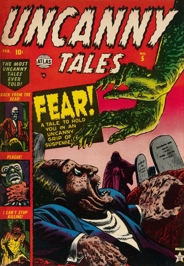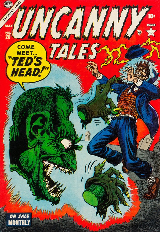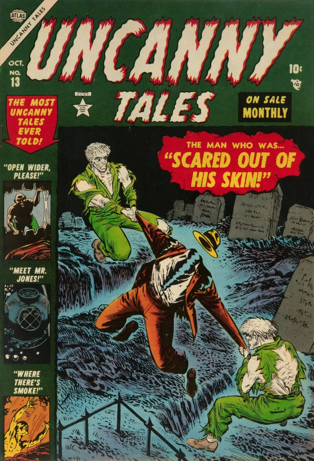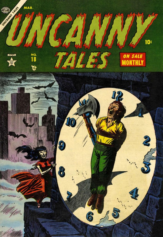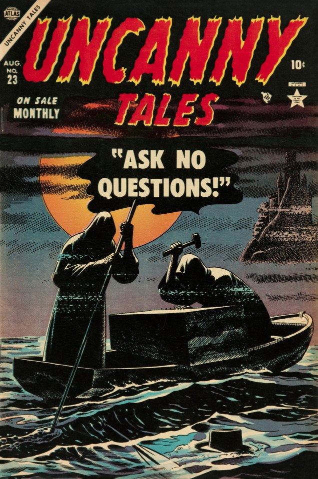 This is Uncanny Tales n. 5 (Feb. 1953, Atlas), cover art by Bill Everett, colours — consistently fine! — presumably by Stan Goldberg in all cases.This is Uncanny Tales n. 6 (Mar. 1953, Atlas), cover art by Bill Everett.This is Uncanny Tales n. 13 (Oct. 1953, Atlas), cover art likely a collaboration by Sol Brodsky and Carl Burgos.This is Uncanny Tales n. 17 (Feb. 1954, Atlas), cover art by Bill Everett.This is Uncanny Tales n. 18 (Mar. 1954, Atlas), cover art by Russ Heath. For a gallery of further Heath spookies, check out this entry from last year. This endearingly goofy one is Uncanny Tales n. 20 (May 1954, Atlas), with cover artist Robert Q. Sale giving it his best Joe Maneely imitation.Surely the leading candidate for “Most understated Marvel cover of the 1950s”… if not of all time. Stan must have been away from the office. This is Uncanny Tales no. 23 (Aug. 1953, Atlas); Art by Russ Heath. I’m understandably reminded of that old-timey jibe, « Walk East until your hat floats ».This is Uncanny Tales n. 27 (Dec. 1954, Atlas), cover art by Max ‘Carl Burgos‘ Finkelstein.And one post-Code entry, since it’s so outstanding. This is Uncanny Tales no. 48 (Oct. 1956, Atlas), Another subtle one by Russ Heath, but in a totally different register. Kudos!