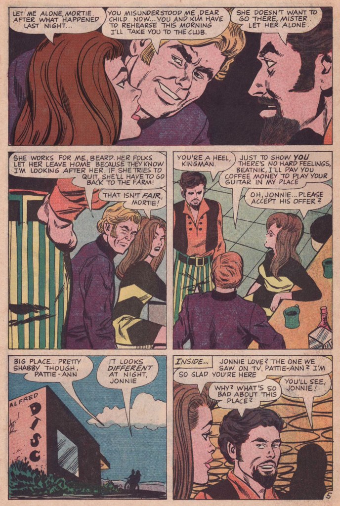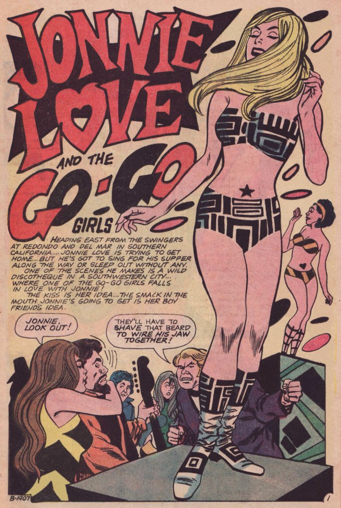 It was actually rather difficult which tale to feature, for they’re all pretty good, and I had to decide on some sort of optimal concomitance of a good plot and how the story was told visually. The final decision was Jonnie Love and the Go-Go Girls, published in Teen-Age Love no. 63 (April 1969), which I think strikes a good balance between plotting and interesting art, and is a fairly typical example of Jonnie’s behaviour in general.