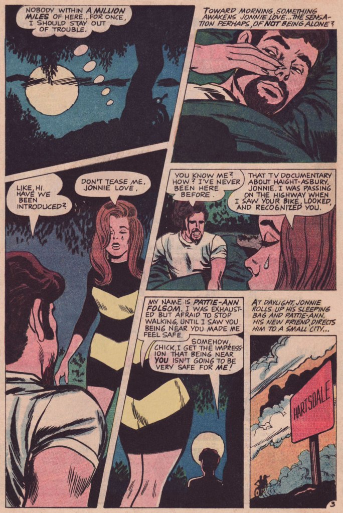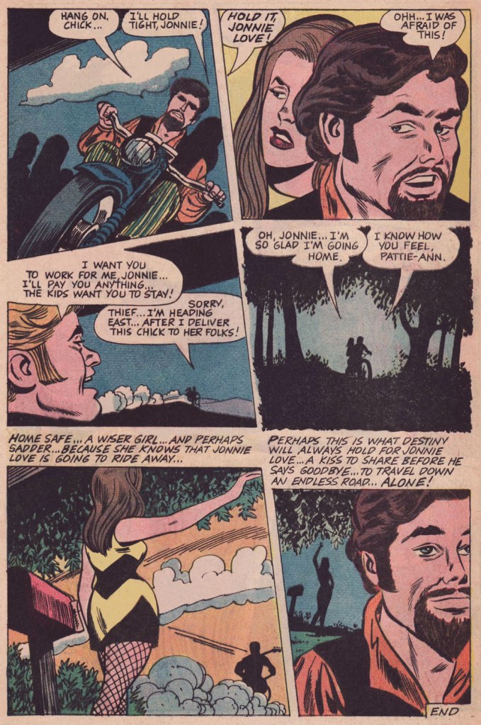 If you were a teenager in the ’50s, 60s, or 70s, you probably would have read romance comics, immensely popular at the time. Charlton Comics published a whole bevy of them, and co-admin RG has amassed a respectable collection. For weeks now I’ve been reading issues of Teen-Age Love during my lunch hour, specifically for their Jonnie Love stories. Introduced in Teen-Age Love no. 61 (November 1968) as the ‘new teen swinger’ – ‘he has a way with a guitar and a way with girls!’, Jonnie lingered within its pages for quite a while, having all kinds of adventures, hanging out with new conquests and lost souls in every issue. As advertised, he was indeed good with a guitar. Joe Gill, who was scripting the stories, wrote him as a kind of chevalier errant, wandering from town to town (with the ultimate goal of going back to his hometown, which he never achieves), offering a helpful hand to damsels in distress who are running away from predatory men, disciplinarian fathers, or just the solitude of a small town.