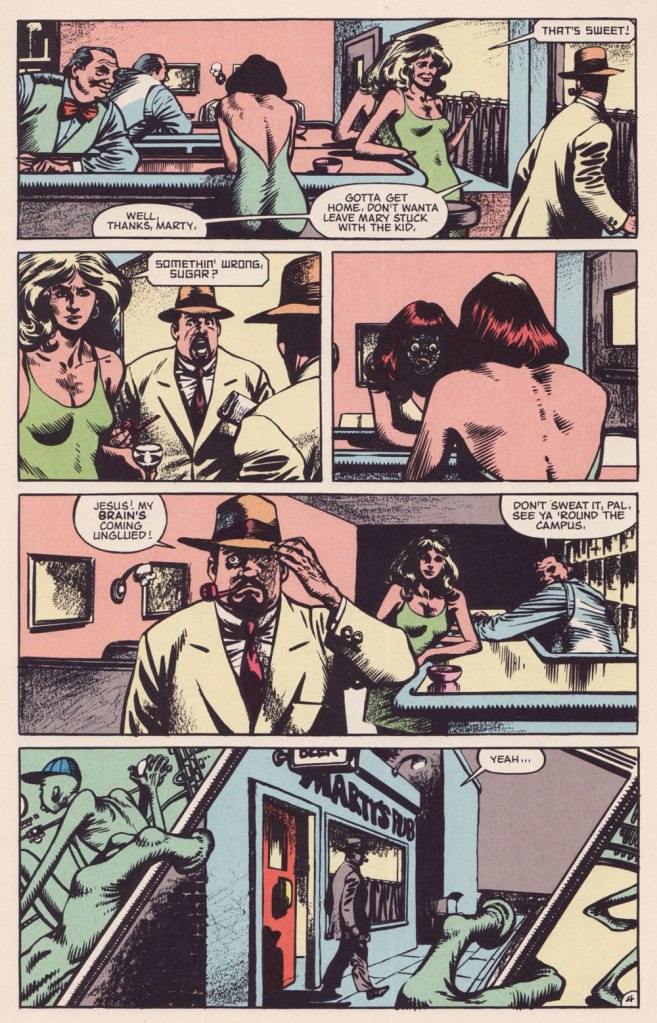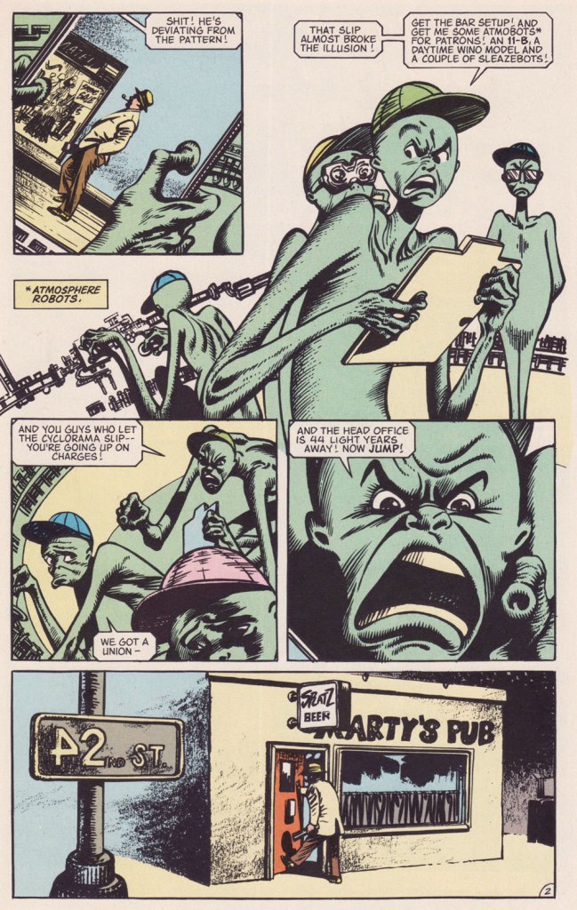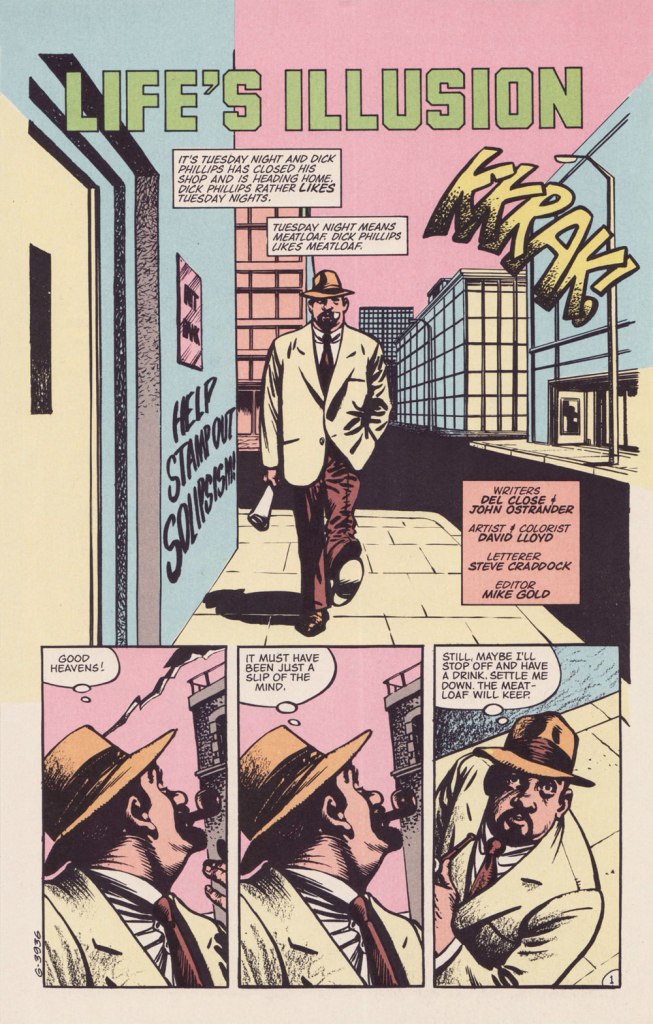 Possibly a reference to PKD’s 1966 novel The Crack in Space?Another cute detail: « From 1948 to 1952, he worked at Art Music Company, a record store on Telegraph Avenue » (in Oakland, CA). Oh, and Robin Williams was a Del Close fan… and vice versa.Life’s Illusion appeared in the final semi-decent issue of Wasteland, no. 10 (Sept. 1988, DC)… beyond that point, it was a painful slide into the abyss. Anyway, I love how this story is able to deftly juggle its elements of comedy, tragedy and Dickian metaphysics without dropping the ball. Poor Mary.