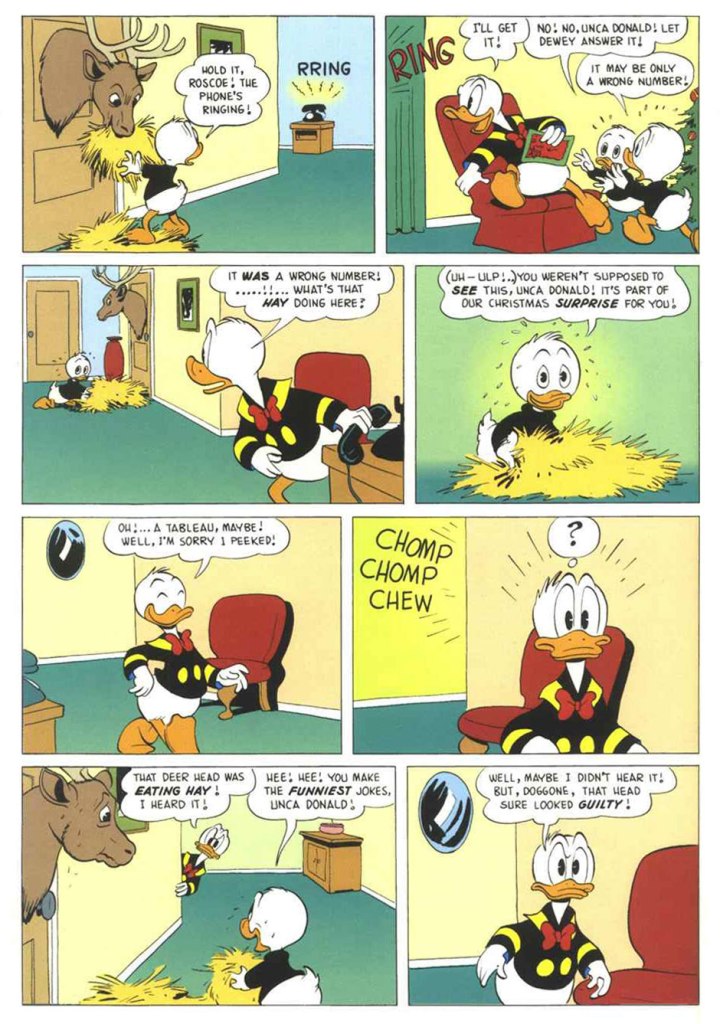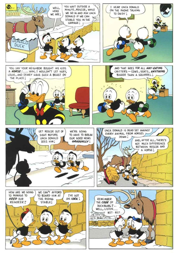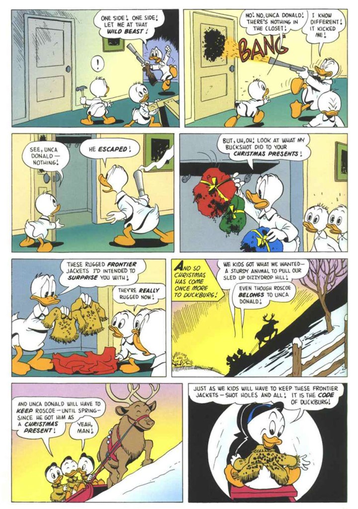 The great Duck Man, Carl Barks, despite having little interest in the holiday, drew over two dozen Christmas-themed stories featuring Donald and his relatives (and wrote the bulk of them). Now, so very much has been written and said about Barks that I won’t bother to add much here. I’ll just let his work speak for itself and breathe. I opted for a lesser-known ten-pager, not coincidentally one of my favourites. “The Code of Duckburg” originally saw print in Walt Disney’s Comics and Stories no. 208 (Jan. 1958, Dell), but I’m using a more contemporary issue boasting better printing and a commendably tasteful colouring job, from Walt Disney’s Uncle Scrooge no. 317 (Jan. 1999, Gladstone). It must be said that the folks at Gladstone did right by the ducks — it was more of a labour of love than a strictly commercial venture.