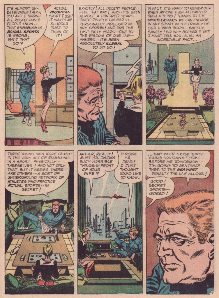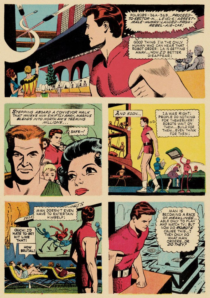 A relevant page from Magnus, Robot Fighter 4000 A.D. no. 1 (Feb. 1963, Gold Key); story and art by Manning, with input from editor Craig Chase, who initially pitched the idea of a SF hero to the publisher.