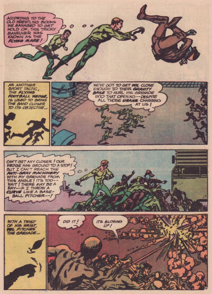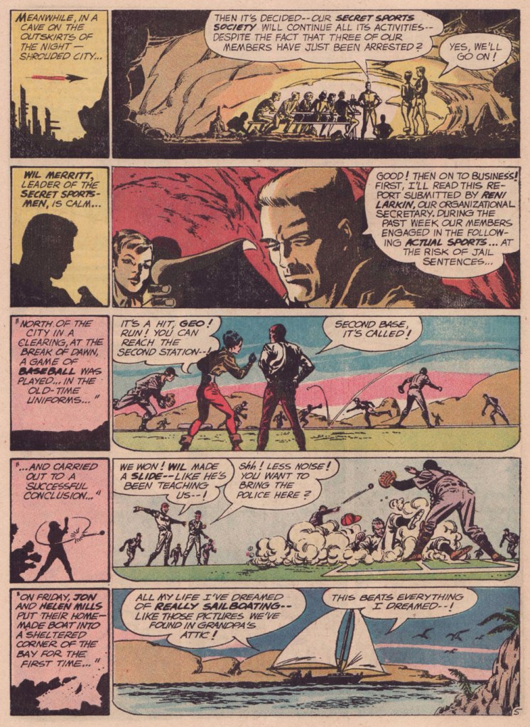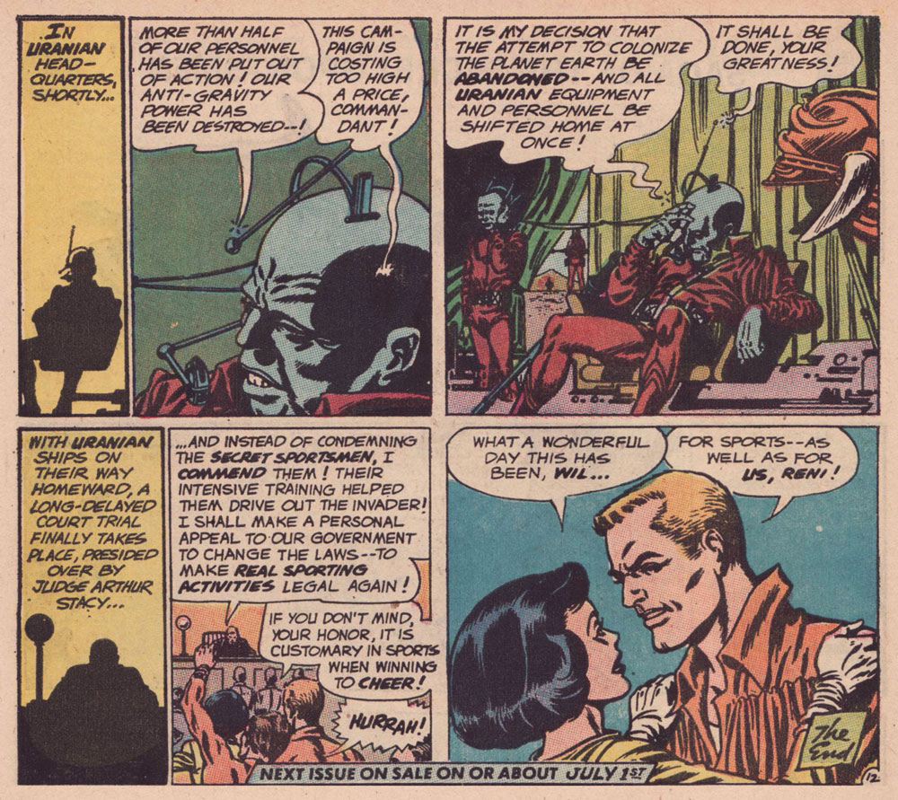 Why am I so fond of this particular story? It’s the little things: for once, a story in a Jack Schiff-edited title makes some semblance of adhering to scientific — or at least science-fictional — principles; here, Elias designed an alien race that, given their grumpy, unprepossessing mugs, would typically have been cast as villains, but instead turn out perfectly honourable; the story’s human protagonists give aid to strangers in need, never asking for a thing in return: no Zarkan mineral rights, no salacious dirt on J’onn J’onzz, just selfless dedication to doing the right thing and the satisfaction of averting a crisis. How refreshingly old-fashioned, a cooling balm for these harrowing times.