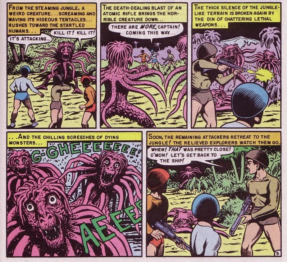 After being told that, clearly, the color of the astronaut’s skin was practically the whole point of the story, Murphy backed down a bit, but said that they would at least have to get rid of the perspiration on his skin. It could possibly be that Murphy felt that it was exploitative. I do not know, and neither did Feldstein nor Gaines, who only had their suspicions that they were being screwed with.