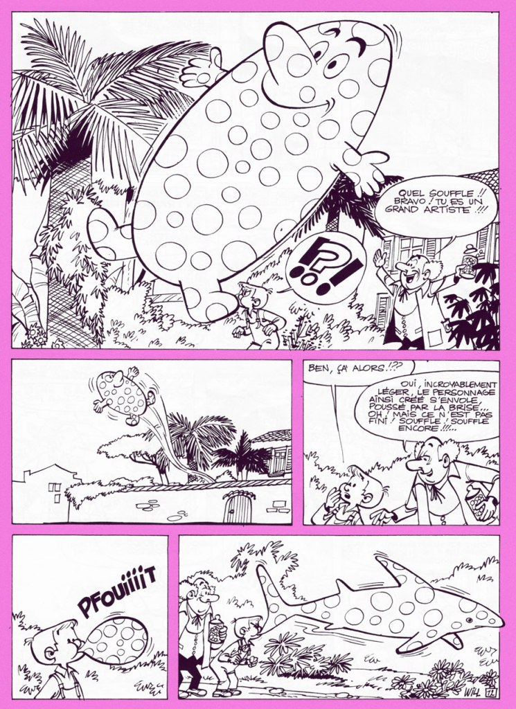 A mere two long adventures (44 pages each) were produced (Le tyran en acier chromé, 1962, and Toute la gomme, 1963, plus a six-pager, Et mine de rien, in 1967), and Dupuis never bothered to collect or reprint them. Instead, well down the pike, two separate, smaller publishers licensed the rights and issued small black and white runs of, respectively, Toute la gomme (Espace Édition, 1976) and Le tyran… (Magic Strip, 1983).
