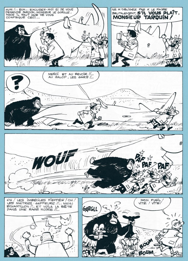 Spirou’s ‘Albums’ were a handy way to dispose of unsold copies of the weekly magazine by collecting a trimester’s worth of issues in an attractive hardcover format. This one’s from March 1948, just to give you an idea of Franquin’s early style.A panel from Le dictateur et le champignon (1953). The ripe banana-coloured critter with the long tail, if you don’t already know, is Le marsupilami, Franquin’s homage to Elzie Segar‘s Eugene the Jeep (introduced in 1935 and known as ‘Pilou-Pilou’ in French Europe).This panel took my breath away as a kid when I first saw it, and it still does. It’s from Spirou et Fantasio no. 8, La mauvaise tête (1954). How many contemporary artists could pull off such a scene — let alone the entire sequence, wherein Fantasio ends up winning the race cycling backwards — at all convincingly? I’ve been reading, for the first time, Franquin’s collected Modeste et Pompon (1955-59). After Franquin was tricked into surrendering his creation to Tintin magazine publisher Les Éditions du Lombard, M&P became just another long-running mediocre domestic strip in many successive pairs of (necessarily) lesser hands… but seeing Franquin bring it to life is a most refreshing pleasure.A dynamic Modeste et Pompon sample from near the end of Franquin’s run. During Franquin’s relatively brief passage at Tintin magazine, he set a new standard of graphic freedom, opening a breach for his successors that Georges “Hergé” Rémi himself did *not* welcome. Tintin’s papa, in fact, deemed Franquin’s supple and organic line ‘vulgar’. Album Spirou no. 70 (March 1959, Dupuis), gathering issues 1081 to 1091 and depicting a scene from Le Prisonnier du Bouddha.Album Spirou no. 96 (April 1965, Dupuis), collecting issues 1395 to 1407. Gaston Lagaffe*, like Le Marsupilami before him, was a minor character introduced by Franquin to relieve the tedium of setting down the adventures of Spirou et Fantasio. The popularity of both these would-be background creations wound up dwarfing that of the intended protagonists. Franquin’s original painted artwork for the cover of Album Spirou no. 100 — well, duh — (March 1966, Dupuis), containing issues 1447 to 1459.