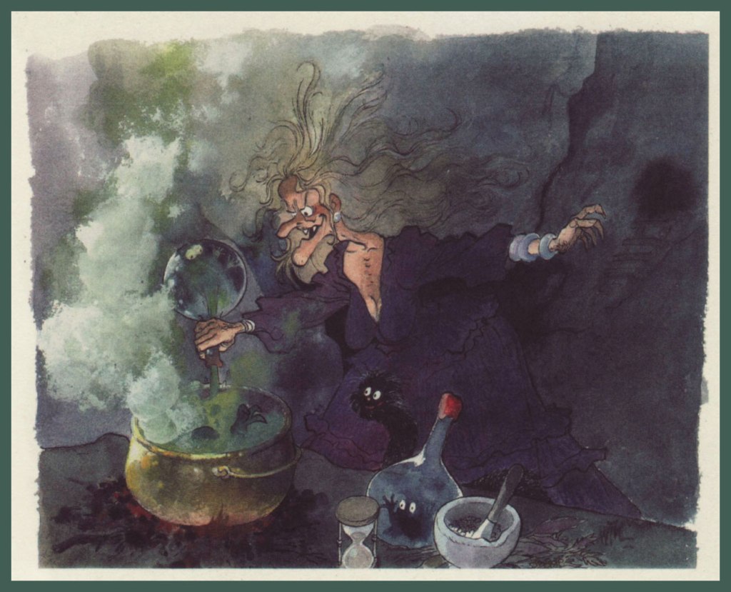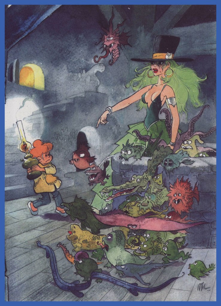 The cover of weekly Spirou no. 1929 (Apr. 3, 1975, Dupuis), beginning the serialization of the seventh Isabelle story (and her third album), Les maléfices de l’oncle Hermès (collected in book form in 1978). This is where two of the series’ pivotal characters, the titular Oncle Hermès and his eventual paramour, sexy witch Calendula, were introduced, not to mention her evil ancestress (the original) Calendula, the series’ archfiend.