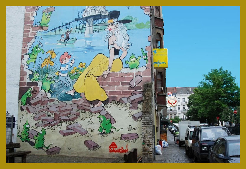 At Ostende’s cozy Le Touquet seaside restaurant, we were shown the shortest path to the loo by no less a personage than the legendary Cowboy Henk, touting local drink Blonde Kuif.This group scene from René Goscinny and Albert Uderzo‘s Astérix was appropriately located in a schoolyard, with kids eagerly playing ball just a few metres away.In a different range, this mural suitably pays homage to French ‘ligne claire‘ master Yves Chaland (1957-1990).It was nice to see the frescoes maintained. This one, located in Antwerp, celebrates Flemish cartoonist Jeff Nys‘ Jommeke: « It seems fitting that this wall by artist Jef Nys, the greatest Flemish cartoonist for children, is in an area surrounded by schools. His most popular comic was Jommeke, a story about a young boy, with a pet parrot named Flip, who goes on some crazy adventures along with his best friend Filiberke. Nys started Jommeke in 1955 and created close to 300 comic albums. They have sold over 51 million albums alone in Belgium, making Jommeke the second best-selling comic series in the country. » [ source ]I’ve no idea who these characters might be, but I raise my glass (of Belgian beer, naturally) to the vibrant creativity of the nation’s graffiti practitioners.Another lovely one saluting one of Belgium’s bédé superstars, Maurice de Bevere, alias ‘Morris’ (1923-2001).We found that Brussel’s streets were frequently adorned with striking mosaic markers, such as this one, featuring André Franquin‘s Marsupilami. I forget what thoroughfare this was, I’m afraid.This one captures Philippe Dupuy and Charles Berberian‘s Monsieur Jean and his presumed and entirely laudable and justified appreciation of Belgian beer, the world’s finest — you can keep your IPAs, thank you.A mural devoted to Michel Greg and Daniel ‘Dany‘ Henrotin’s Olivier Rameau, fittingly painted on the side of a Fireworks store at 9, rue du chêne, Brussels. Top to bottom: Ebouriffon, Olivier Rameau, Colombe Tiredaile, the 3 Ziroboudons, Alphonse Pertinent.Despite having no Belgian roots that I can figure, Hugo Pratt‘s Corto Maltese clearly is beloved in these parts. He landed no fewer than *four* murals, all neatly in a row. Here are my two favourites.A most unusual — and striking — composition.And now we come to my Holy Grail, Brussel’s Gil Jourdan mural… there are two more in Maurice Tillieux‘s hometown of Auderghem (here’s one, and the other, and yet another in the bédé-themed Janson metro station in Charleroi). The author appears for size comparison.Local graffiti artists come to the rescue: it seems inconceivable — to me, anyhow — that there isn’t a mural devoted to Willy ‘Will’ Maltaite‘s characters. There used to be a lovely « Isabelle » fresco in Brussels, but, citing damage, it was painted over in 2017. However, here’s an unofficial, and brilliant one featuring Tif et Tondu… and their archnemesis, Monsieur Choc. Take a bow!