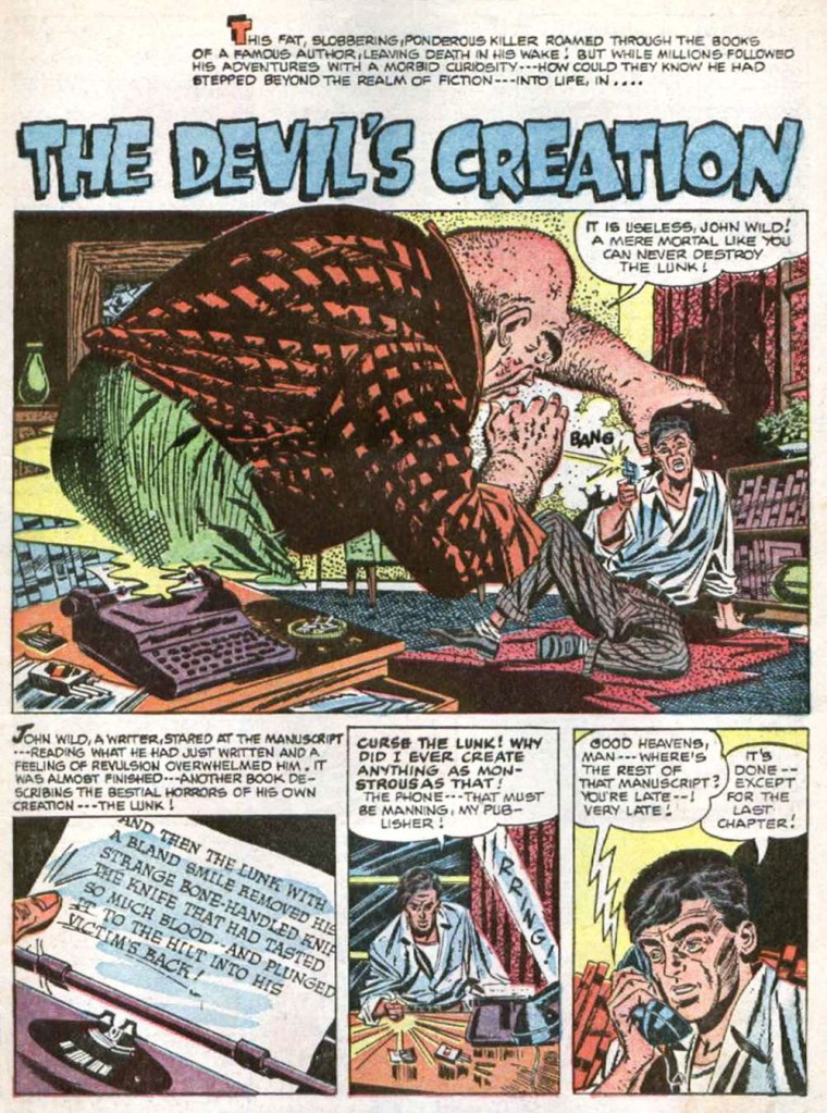 The Devil’s Creation originally saw print in Beware! Terror Tales no. 2 (July 1952, Fawcett). Scripter unknown, art by Mike Sekowsky (1923-1989).On a small town kid’s budget, some US comic books were highly unlikely to turn up on my local spinner rack. Besides, I didn’t even know English yet. But these French digests (162 pages for 35 cents!) could be a godsend. This one came out slightly before my time, but I somehow landed a second-hand copy. This is my dog-eared Eclipso no. 9 (Oct.-Dec. 1970, Arédit); I was, within its pages, introduced to — besides Eclipso — Deadman, The Spectre, The Doom Patrol, The T.H.U.N.D.E.R. Agents and Mark Merlin.