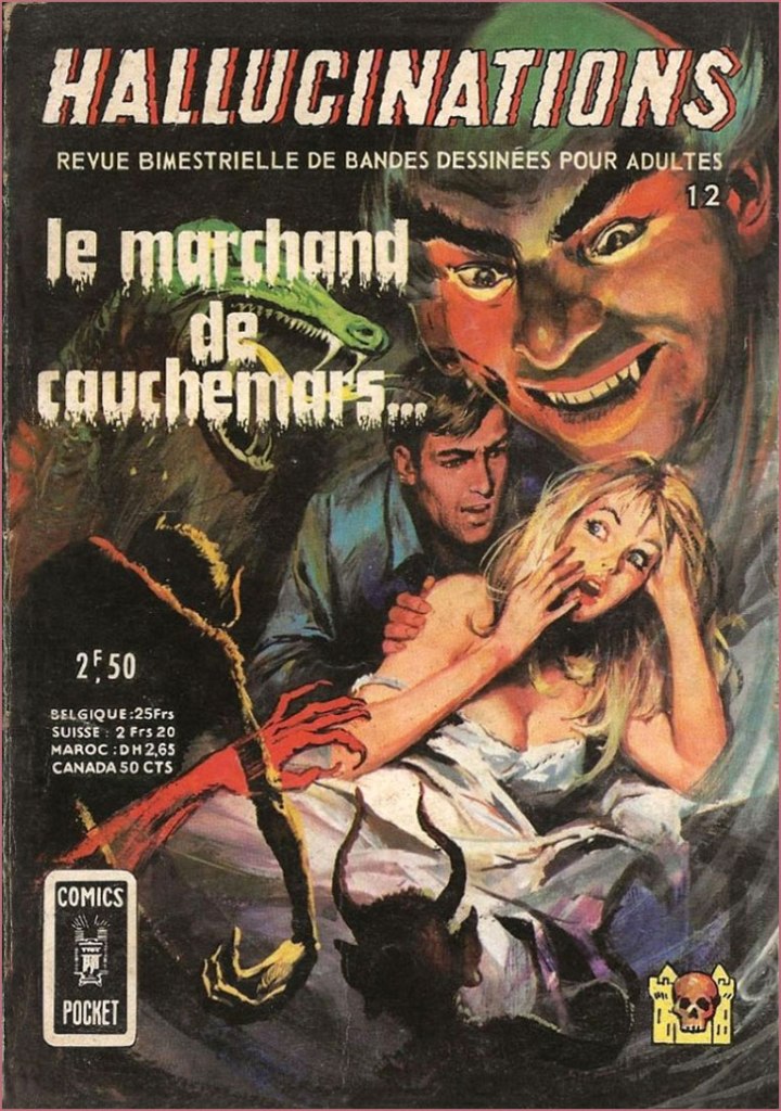 This is Hallucinations no. 12 (Nov. 1971, Arédit). Cover artist unknown. The series must have met with some success, as its publishing frequency increased from quarterly to bi-monthly. I swear I recognise that style; around 1980, I had a European sticker album of spooky scenes that this artist illustrated. I’ll dig it up yet…