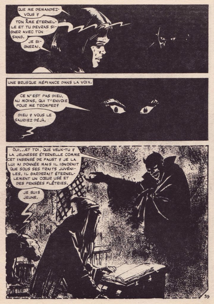 Illustrator unknown, wouldn’t you know it? Given his skill, style and stamina, I’m guessing he’s Spanish, but beyond that, I’m drawing a blank. Still, kudos to this anonymous artistic practitioner.I know, I know: it’s Warren’s Uncle Creepy with a pencil moustache. Jeannine agrees to the Faustian deal Leggatt proposes.A handsome doctor thinks he can save the woman he loves. Randa sets up the usual scenario, all the better to kick the reader’s legs out from under him. Le banquet des ténèbres — the bédé adaptation — saw print in Eclipso no. 30 (June 1973, Arédit). Amusingly, mycomicshop.com’s archivist describes Eclipso as ‘French publication reprinting comics from various Marvel properties.’ Well, not exactly. The title should clue you in: the anthology started out reprinting DC series such as Eclipso, Deadman, Mark Merlin, Challengers of the Unknown, Hawkman, Doom Patrol… while also dipping into Tower’s T.H.U.N.D.E.R. Agents, for instance. Marvel got stirred into the mix in the early 1970s, then came a period of French novel adaptations, then back to US comics, mostly from Marvel. The ride ended in 1983.