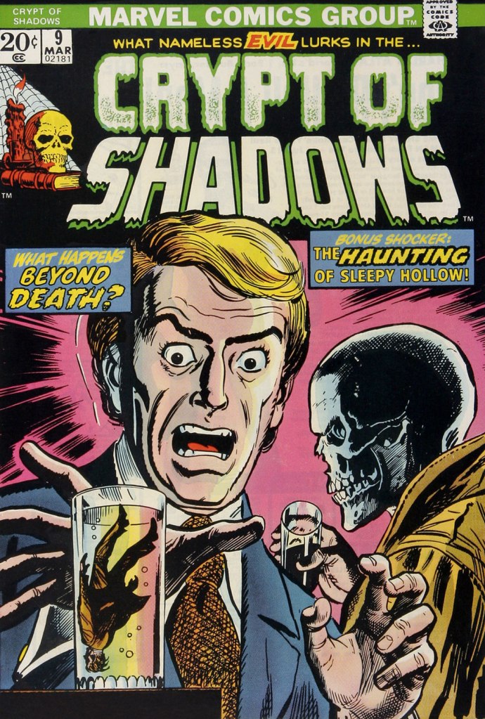 … is, if not ruined, then at the very least diminished by clumsy and pointless updates, including the removal of Heath’s signature (although upon seeing the ‘improvements’ perpetrated upon his work, he might have opted for the comics equivalent of an ‘Alan Smithee‘ or ‘Cordwainer Bird‘ credit). This is Crypt of Shadows no. 9 (Mar. 1974, Marvel). Alterations, once more, by unknown, guilty hands. Also edited by Roy Thomas (just so you know who’s responsible).