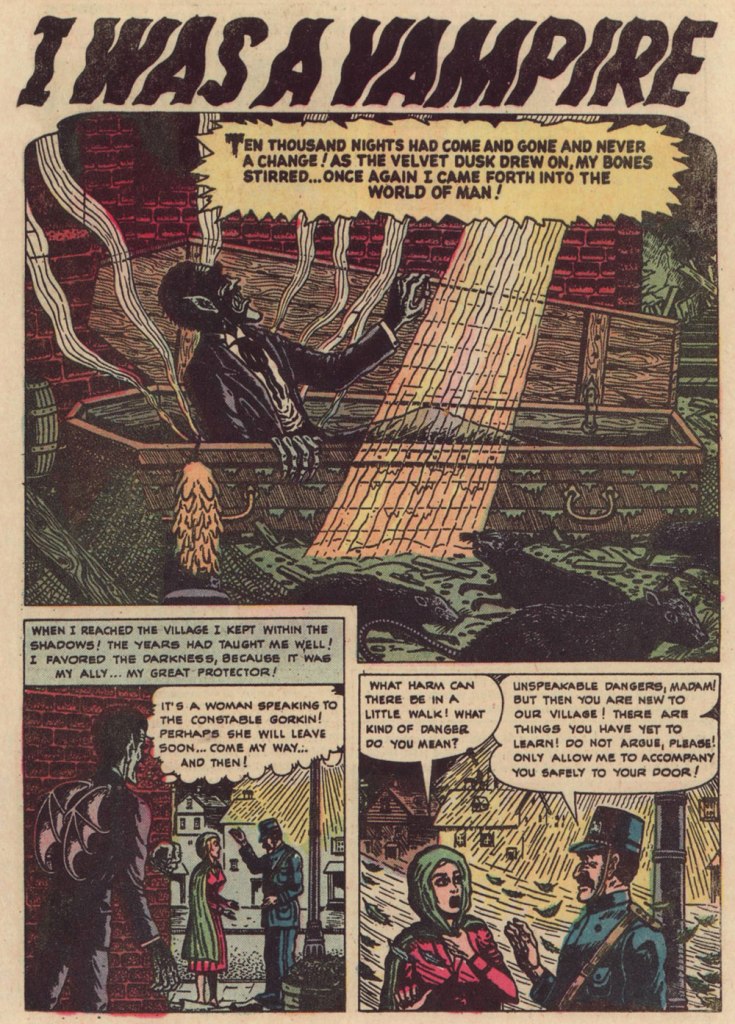 I’ve expressed many a time my ambivalent affection for Golden Age Atlas horror comics: in short, despite their slapdash, often incoherent writing, they had a solid stable of artists (which makes the thin writing all the more disappointing); but most of all, they generally had eye-catching covers, splendidly coloured (easy a task to underestimate!) and blessed with a light touch absent on the insides.