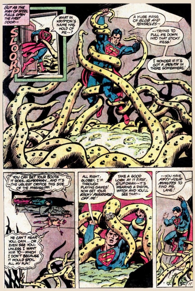 What do we have here? A harmless trick-or-treating kid transformed by Mr. Mxyzptlk into a malefic octopus? It’s business as usual for Superman in this goofy tale (who, incidentally, was the star of Tentacle Tuesday: It’s a Bird! It’s a Plane! It’s a Tentacle!) I’m sure most children would relish the opportunity to become an actual ghost or werewolf…