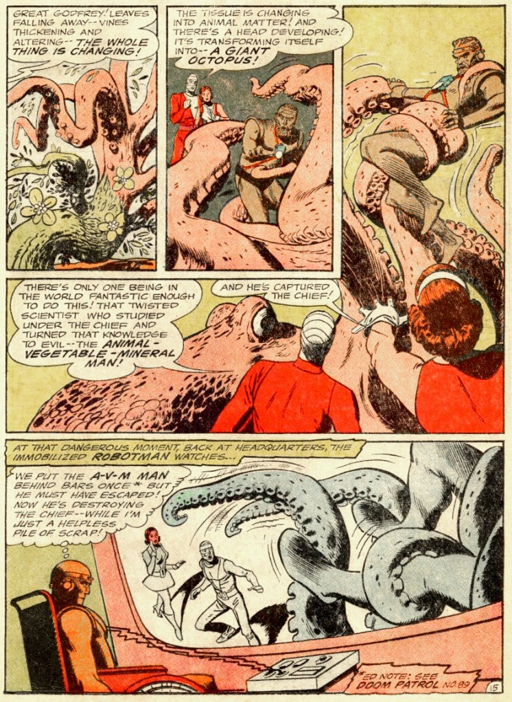 In Return of the Animal-Vegetable-Mineral Man, scripted by Arnold Drake and illustrated by Bruno Premiani, the Doom Patrol battle a scientist crazed with power-lust (while dealing with trouble of their own, like being unable to control their powers – it was apparently decided that a scientist who can become anything he likes is not interesting enough).