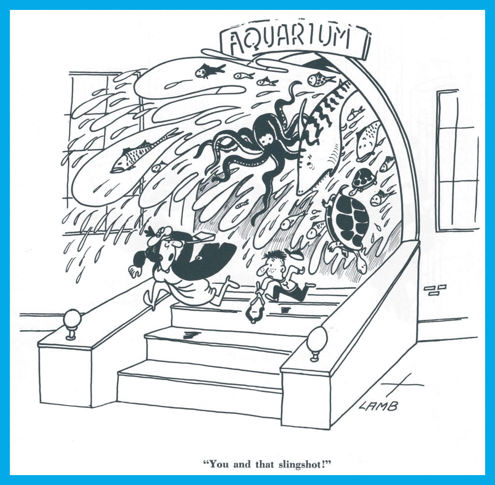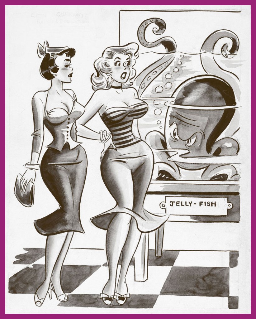 Dan DeCarlo’s pulchritudinous beauties visit the aquarium. Don’t forget to take a gander at RG’s Dan DeCarlo at Humorama (1956-63) post! Also, ‘jelly-fish’?! I am appalled. This cartoon had two captions, both equally lame – for example, ‘That reminds me, Jack is calling for me tonight…’ I don’t think DeCarlo was too interested in fleshing out the background, either.