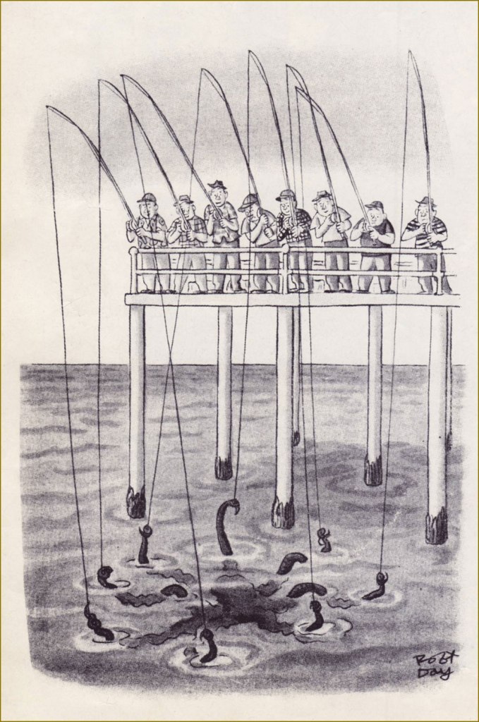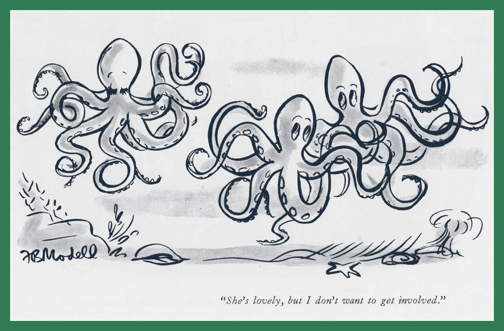 A sly cartoon by the prolific Robert Day (1900-1985), a frequent contributor to The New Yorker. That octopus will have a hefty supper!