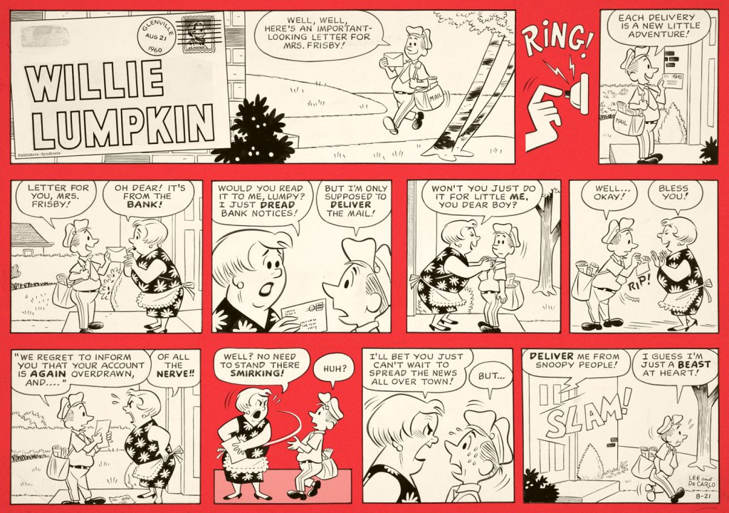 Willie Lumpkin was created by Dan DeCarlo and Stan Lee when Harold Anderson, the head of Publishers Syndicate (which merged into Hall Syndicate, which was eventually purchased by Hearst and is now part of King Features…) wanted a ‘bucolic’ newspaper strip set in some small town. The ‘friendly mailman’ idea is supposed to be Anderson’s, the family name Lee’s.