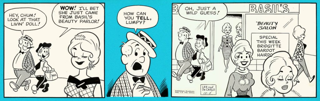 I cannot say that it’s a very funny strip (well, it was written by Lee, need we say more?), but it has a certain charm, and DeCarlo’s art is highly enjoyable, even though one occasionally feels like one has stumbled into an Archie story. DeCarlo liked drawing cheesecake, and we enjoy looking at it (for the heavy guns, visit RG’s Dan DeCarlo at Humorama (1956-63)), but in this case it is the other characters I am interested in, the kids with dirt behind their ears, spinster aunties in funny glasses, and of course the adorably bookish Lumpkin, the glue that holds the denizens of this small town together.