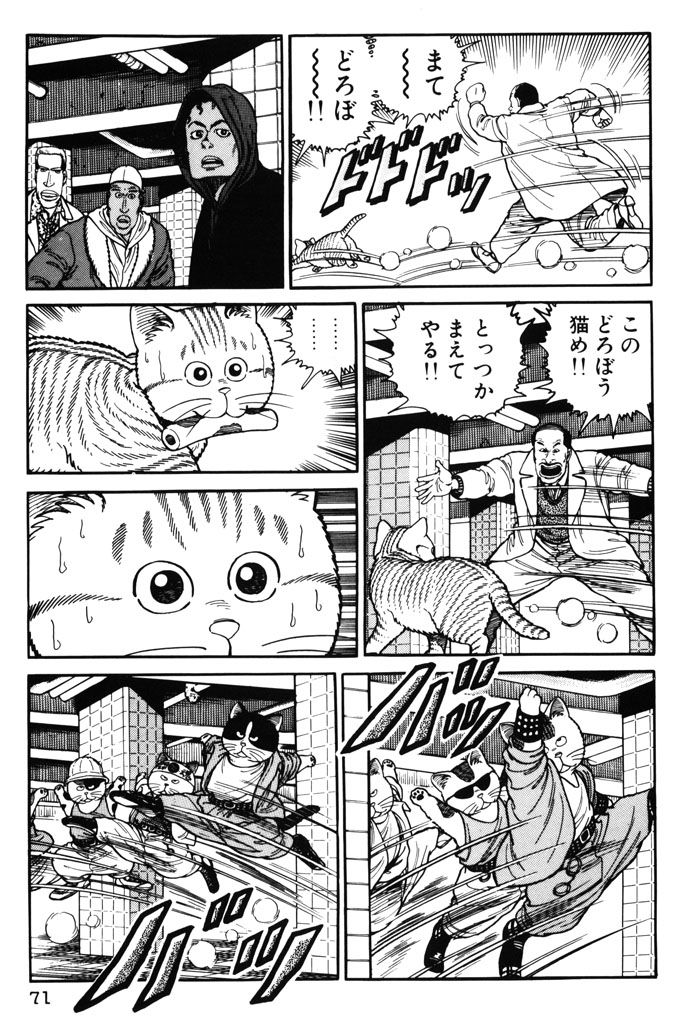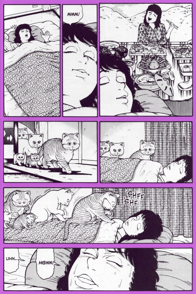 Some readers are more interested in the outlandish stories, of which there are many (ranging from cat parodies of various movies to plain weirdness), some develop a soft spot for the recurring human (or semi-human) characters. Michael himself switches owners like switching gloves, depending on the needs of the story, and there is not much continuity. Kobayashi’s ideas can be a little hiss or miss, but there’s something here for everyone… provided you like felines, of course… adventures of a vampire count who is scared of cats are side-by-side with wacky cat food commercials, depictions of everyday life of various cat-besieged country bumpkins alternate with cat street gang rumbles, and all of that is sprinkled with humans-as-pets interludes. And, naturally, our ordinary yet handsome tabby Michael drinks, sleeps and plays alongside Popo, his wife, their kittens, and a rotating cast of other cats (Catzilla comes to mind!) and the poor, often put-upon dog nicknamed Bear.