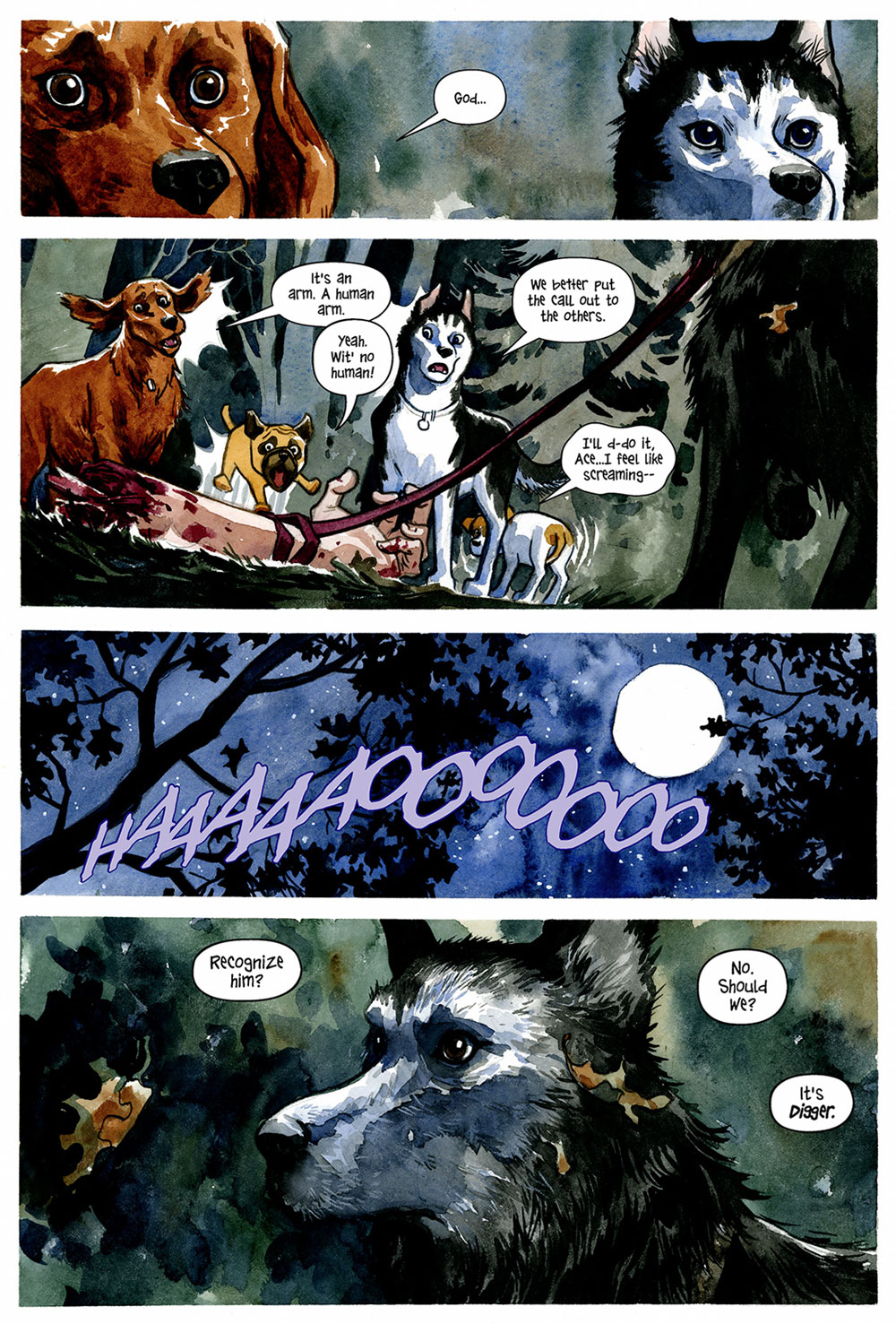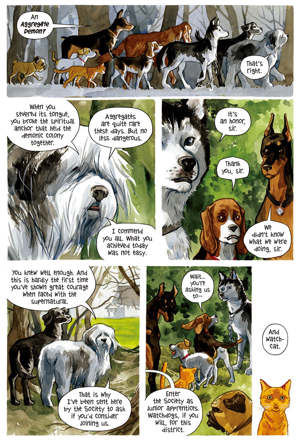 Another page from The Gathering Storm, published in Beasts of Burden no. 1 (September 2009); the moment when the gang officially becomes watchdogs. Most of the dogs have collars, but can dash around with ease, barely ever running into humans.
