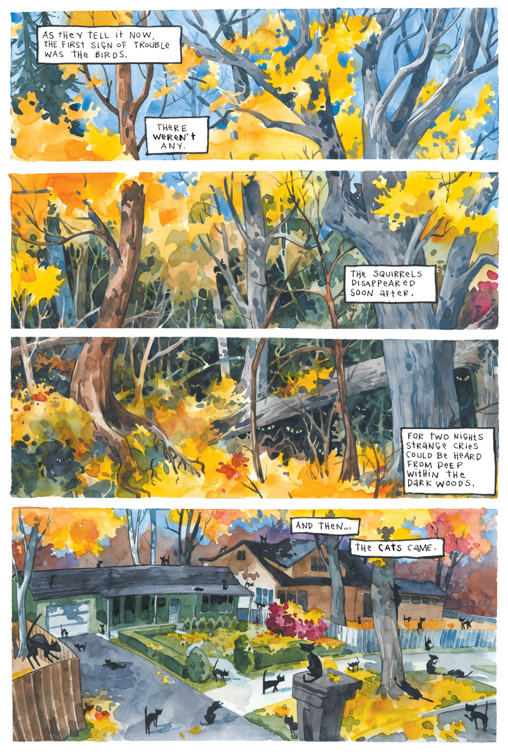 Page from The Unfamiliar, published in The Dark Horse Book of Witchcraft (July 2004). My favourite season is fall, so I couldn’t resist featuring a page of autumnal-blaze trees and black cats.