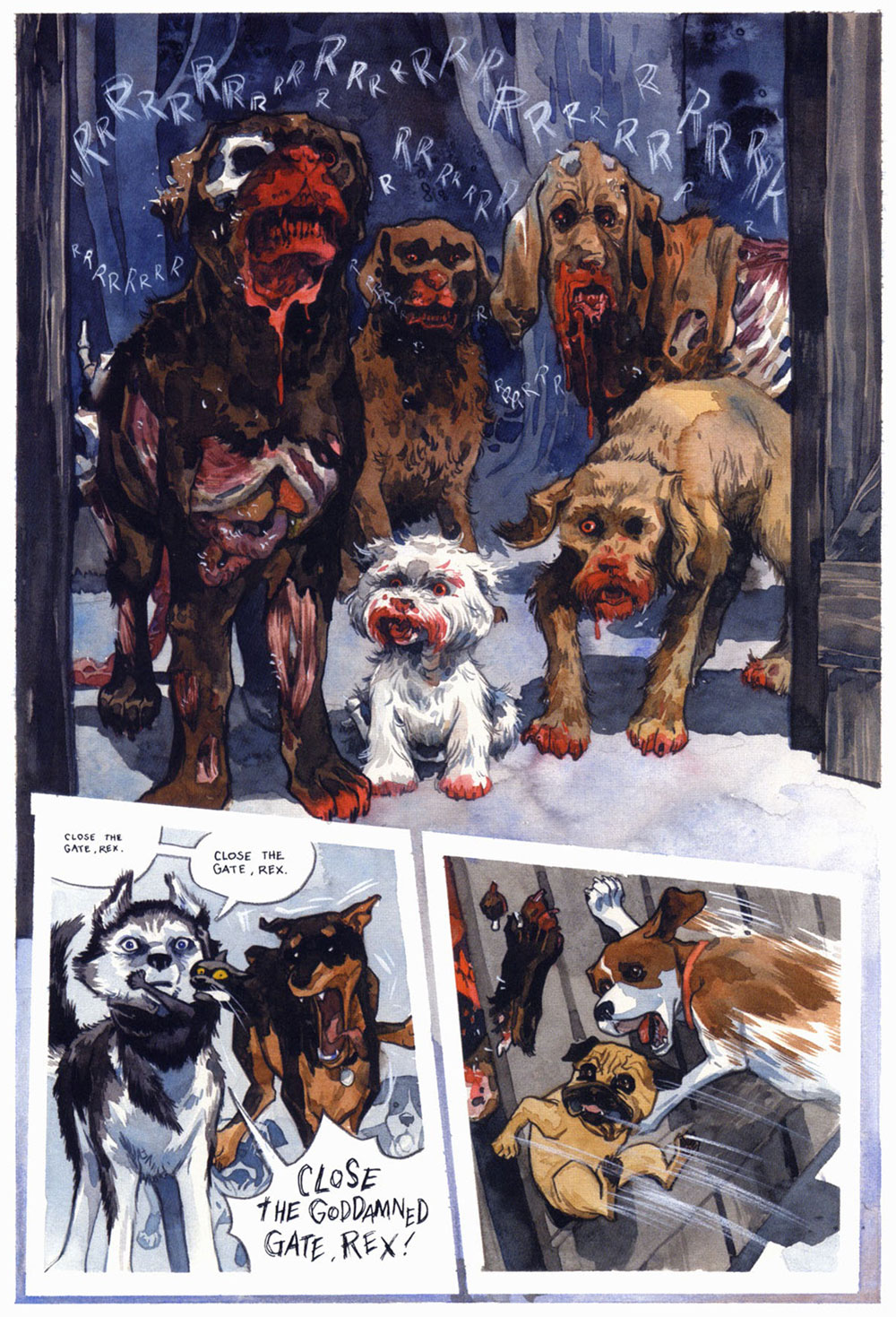Our heatwave is nowhere as bad as the one afflicting Europe right now, but it’s a heatwave nevertheless, and to cool off I felt like traipsing down the icy corridors of horror. Evan Dorkin‘s series Beasts of Burden, the tale of a (predominantly) canine crew who fight the supernatural to keep their small town community safe, fits the bill: though including elements of adventure, mystery, and humour, it’s genuinely tense in places (and features enough blood and grue to keep the average gorehound satisfied). One expects a comic in which all protagonists are animals to evoke baby-talk sounds of endearment, not send chills down the spine of the more sensitive reader, and yet…