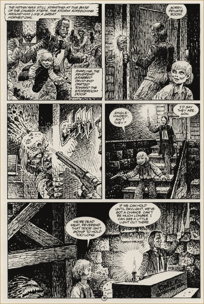 Well, I haven’t read the novel, but the comics adaptation, by seasoned scripter Neal Barrett Jr. (1924-2016) and illustrator Jack ‘Jaxon’ Jackson (1941-2006), is exemplary… well, the results are, at any rate. While we’re not dealing with anything truly new here… I mean, it’s a zombie siege in the well-trod Night of the Living Dead tradition, but in an Old West setting. But the pacing is flawless, the gore and horror balanced with judicious sprinklings of gallows’ humour — served deadpan — and Lansdale’s trademark brutal frankness strikes just the right tone.