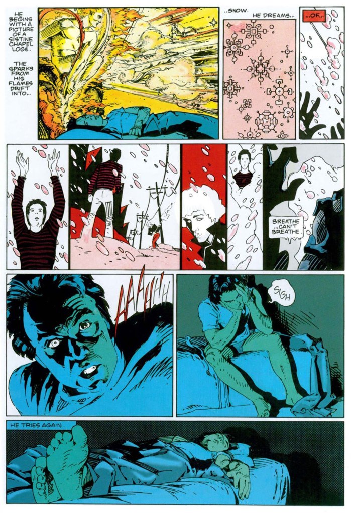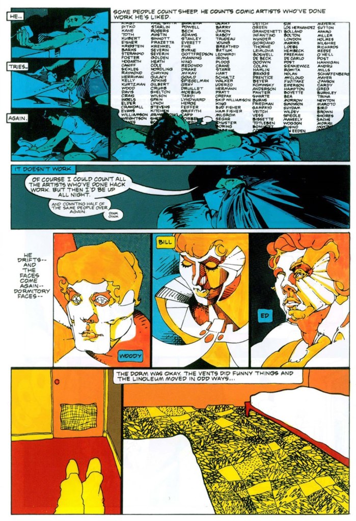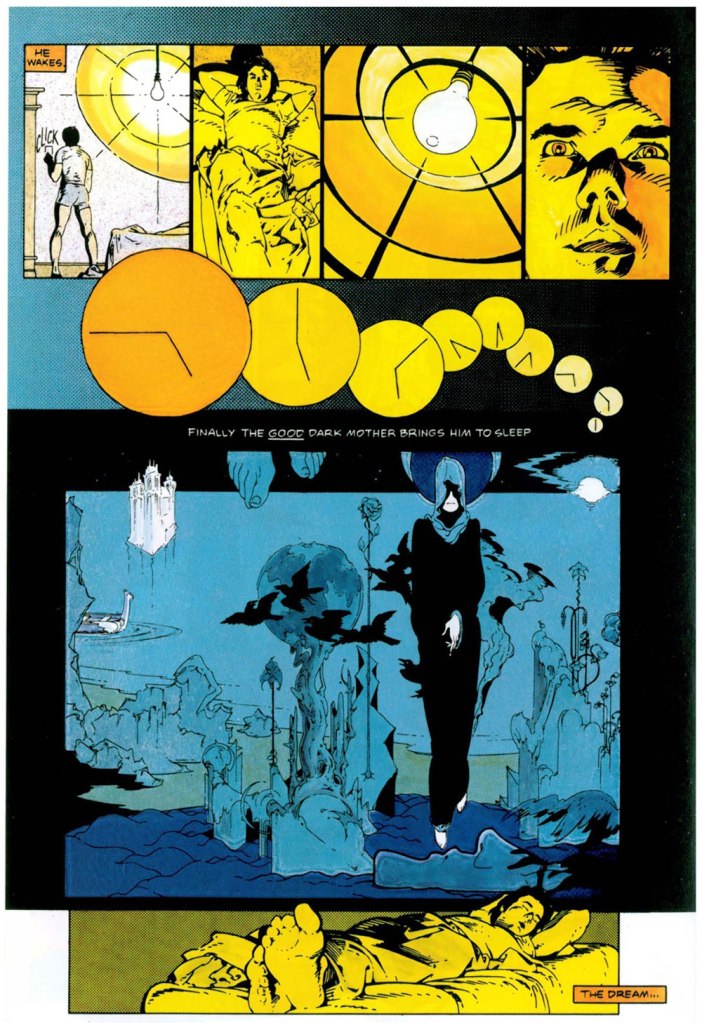 Russell explains: « The Insomniac was conceived in 1979 and realized in 1984. Its walking/dreaming shifts in tone enabled me to work in various visual styles. From the early 80’s sketchbook surrealism to record album covers to photorealism, it incorporated about 15 years of drawing into a 12-age story. »