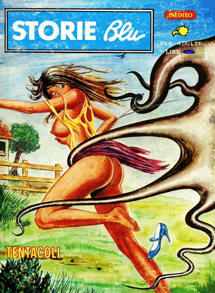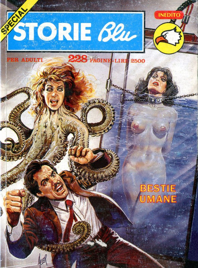 Storie Blu no. 39 (1983, Ediperiodici). This cover is a good example of the “what the hell is going on here” approach Italian erotica often prefers – RG commented that the tentacled female must be the guy’s ex-wife, and his current wife is in the fish-tank. Anything’s possible! Cover is by Giovanni Alessandri (not the grammarian from the 16th century, as you may have initially thought!), who went under Aller.