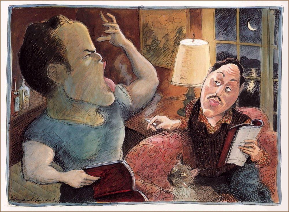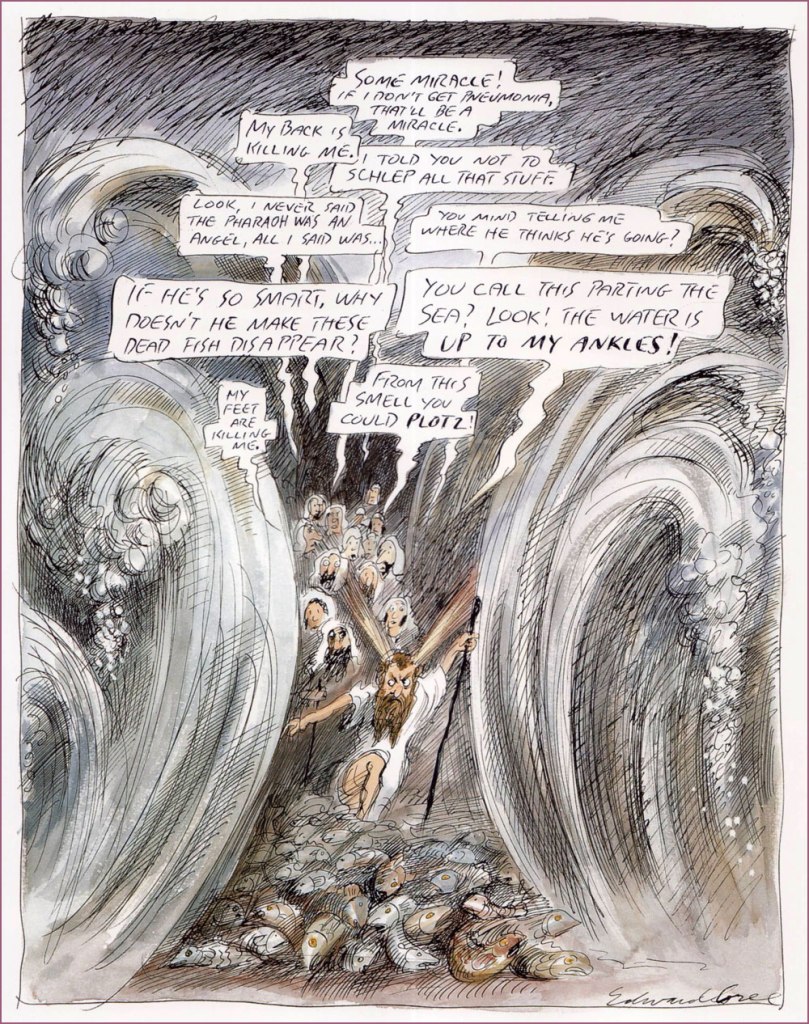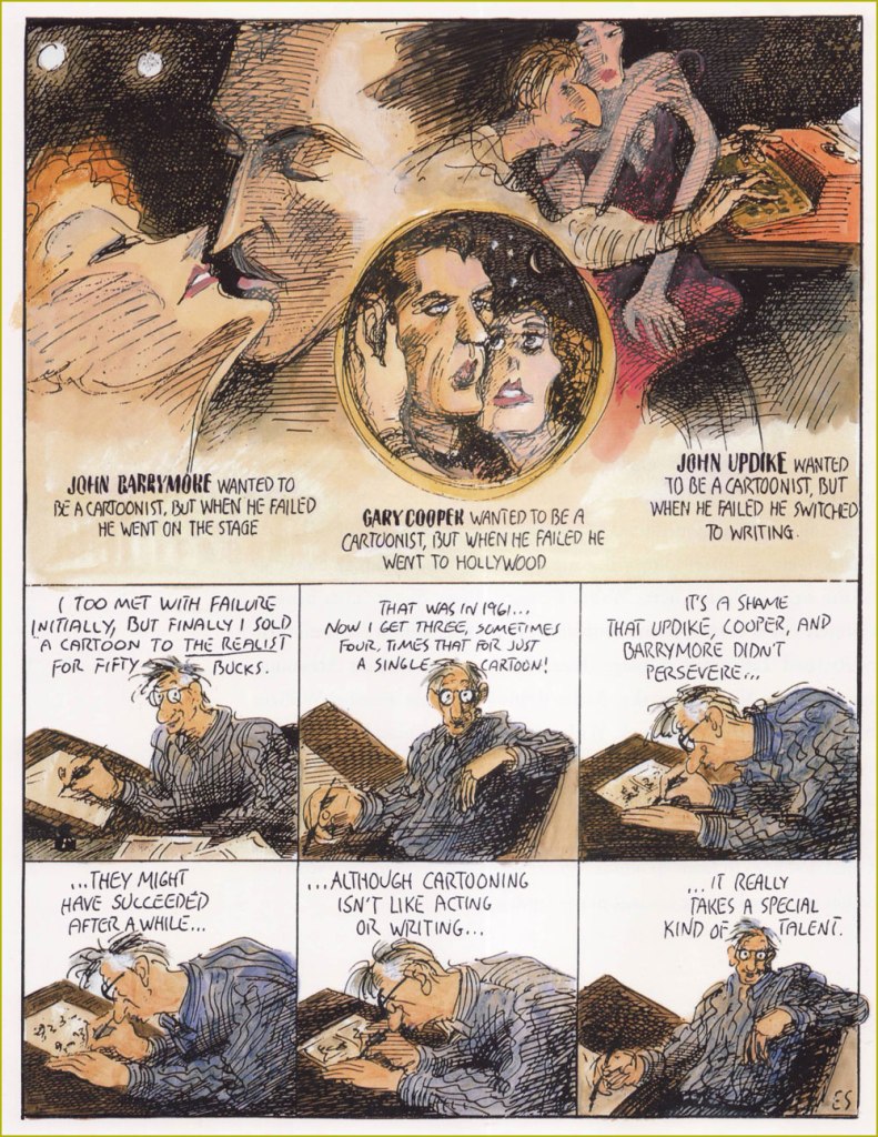 « My long association with Penthouse was unique. They bought every idea I submitted to them, and never changed anything except my spelling. This solipsistic strip appeared in 1990. »He can draw *anything*! This one appeared as The New Yorker‘s Jan. 31, 1994 cover illustration.I suppose every cinephile has his favourite Hitchcock film; mine’s The Lady Vanishes (1938). An entry in Sorel’s “Movie Classics” series, published in the March, 1981 issue of Esquire. « The General, starring Buster Keaton, is the only silent movie I included in my “Movie Classics” series. Based on an actual incident in the Civil War, it often has the look of a Mathew Brady photograph. » From Esquire, Dec. 1980.« Tenor Enrico Caruso is a guest at the St. Francis Hotel when the 1906 earthquake hits San Francisco. He vows *never* to return to a city “where things like this are permitted”. From Sorel’s pictorial essay “Keyhole History” (GQ, Oct. 1984).More rollicking blasphemy for Penthouse (Dec., 1992). Ah, yes. « The 1973 Academy Awards are remembered for Marlon Brando’s refusal to accept his Oscar for The Godfather. His emissary, Apache tribe member Sacheen Littlefeather, explained that Brando’s rejection of the award was to protest Hollywood’s depiction of Native Americans. Backstage, John Wayne was apoplectic. As John Lahr wrote in his article “The Birth of the Oscar“, “The Duke, who had dispatched many an Apache on film, didn’t take kindly to Brando’s protest… Wayne had to be restrained by six men from yanking Littlefeather off the stage.” From The New Yorker, March. 21, 1994. And speaking of Brando… « Marlon Brando is sent up to Cape Cod to read the part of Stanley Kowalski in A Streetcar Named Desire for Tennessee Williams‘ approval. First he fixes the nonfunctioning electricity and plumbing, then he auditions. His performance was stellar in every role. From Sorel’s “First Encounters” series, this entry appeared in Atlantic Monthly‘s July, 1994 issue. Note the kitty’s rapt expression.« Exodus revisited: an educated guess as to what Moses endured as he led his people through the Red Sea. A cartoon for Penthouse, the only mass-circulation magazine to welcome my blasphemy. » Penthouse (like the man said), Apr. 1995. Oh, and Plotz: To burst from strong emotion; often used humorously to express minor shock or disappointment (פּלאַצן, platsn, ‘crack’; cf. German: platzen;) and Schlep: To drag or haul (an object); to walk, esp. to make a tedious journey (שלעפּן, shlepn; cf. German: schleppen;).« Another of my egocentric ramblings, this one a rationalization for not becoming a great artist. » It appeared in the Aug. 21/28 issue of The Nation.« How Was I Supposed to Know? », from The Nation, Sept. 24, 1990. Oh, the sequels just write themselves.Here’s a rather famous one: « Back in the mid-sixties, my friend George Lois had an idea for an Esquire cover that couldn’t be done with photography. He asked me to do it, and I panicked — i.e. I tightened up. When I handed him my finish, he rolled his eyes and said he’d give me until the next morning to do it over. I went beyond panic, but nevertheless did a drawing we were both happy with. » It appeared on the cover of Esquire’s April, 1966 issue, with the caption of “The problems of power for Frank Sinatra”.« Director Michael Blakemore, at a rehearsal of Woody Allen’s one-act contribution to Death Defying Acts, watches in horror as Allen scribbles copious stage directions for him to execute. (Caricaturing Woody Allen is so easy that after drawing him, many an amateur comes to think of himself as a pro.) » From The New Yorker, June 3, 1996. Look at that pen move!