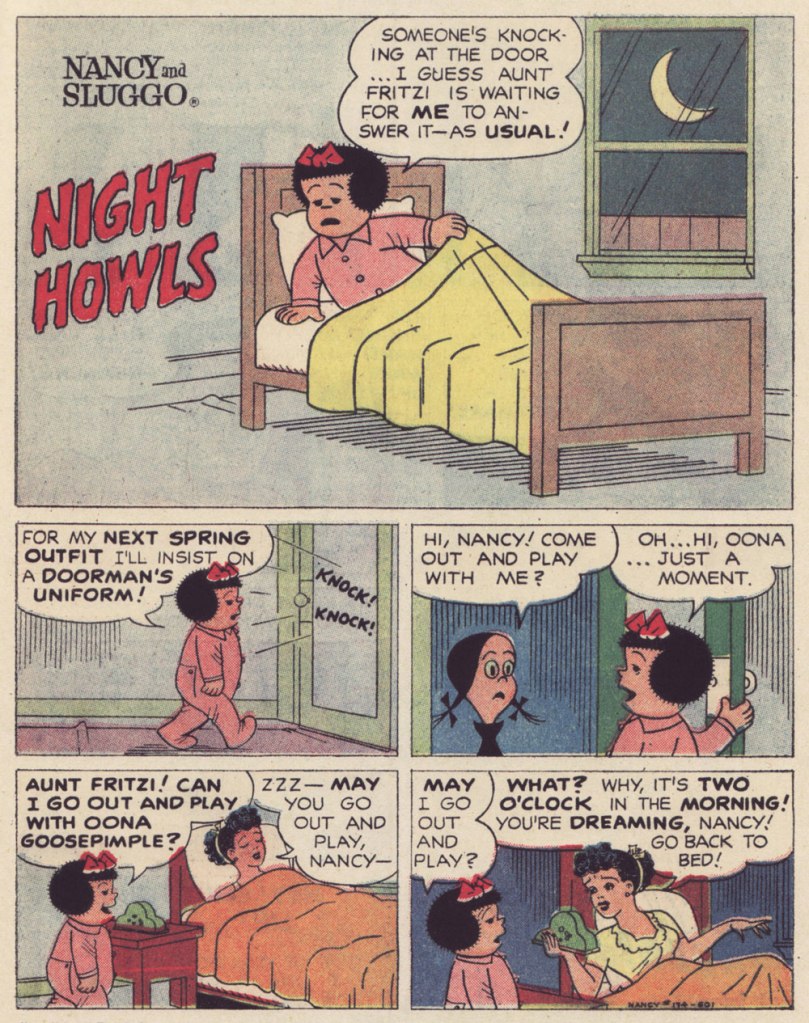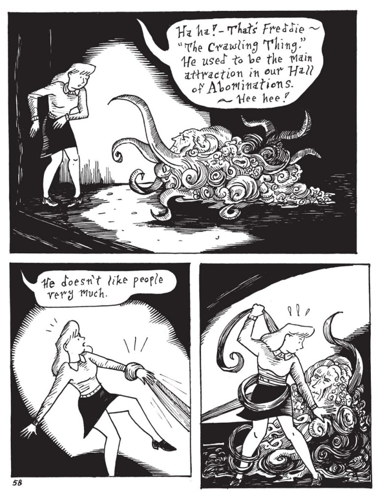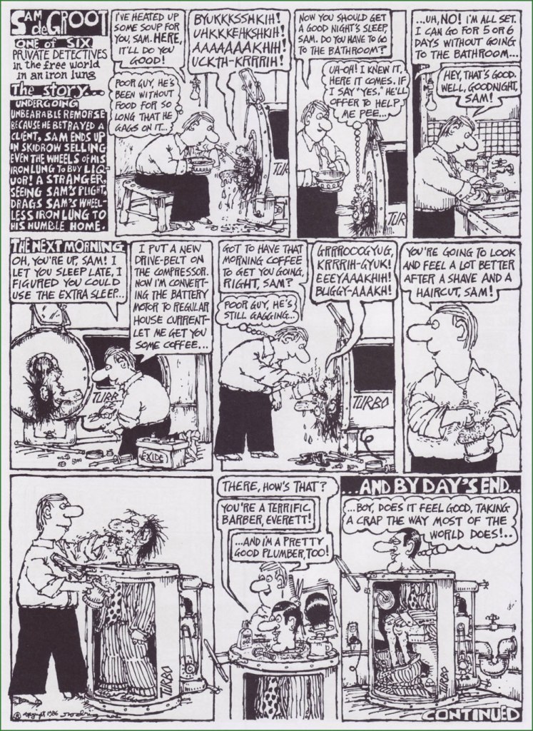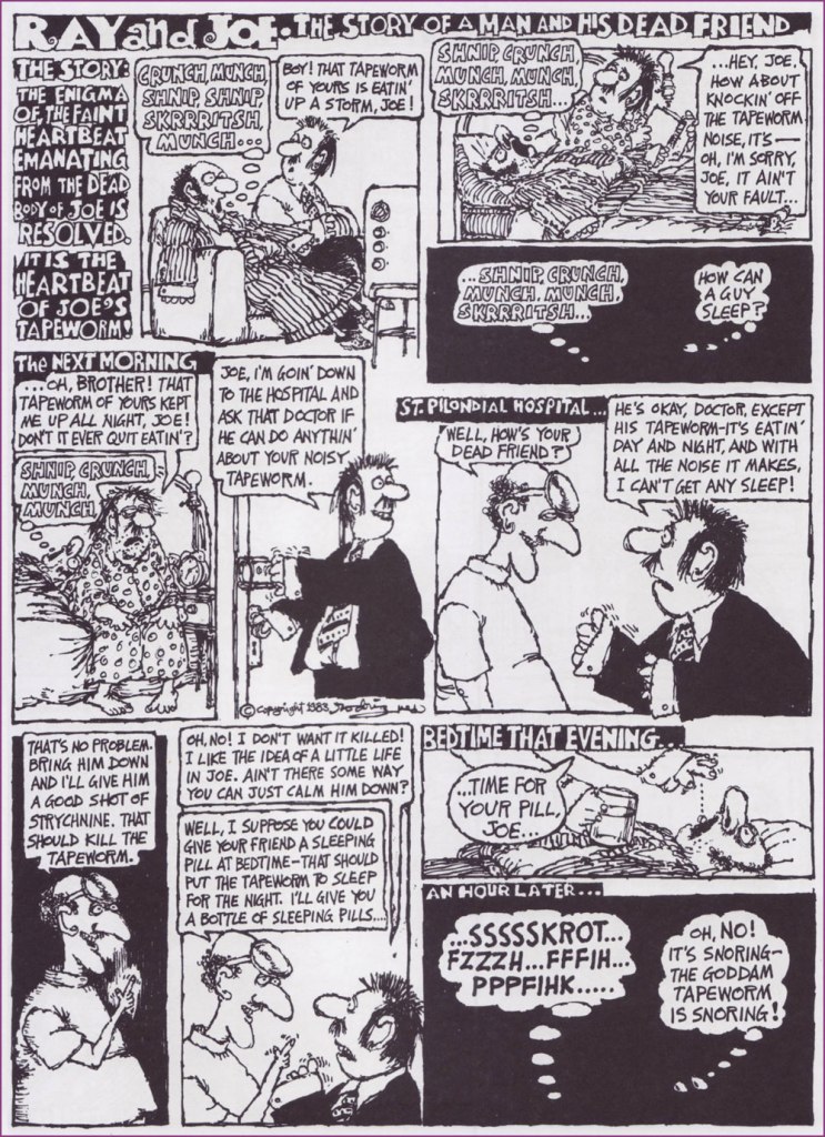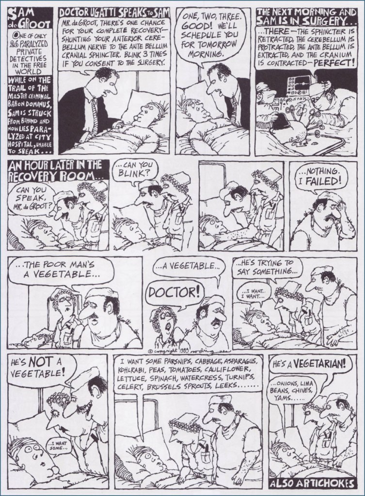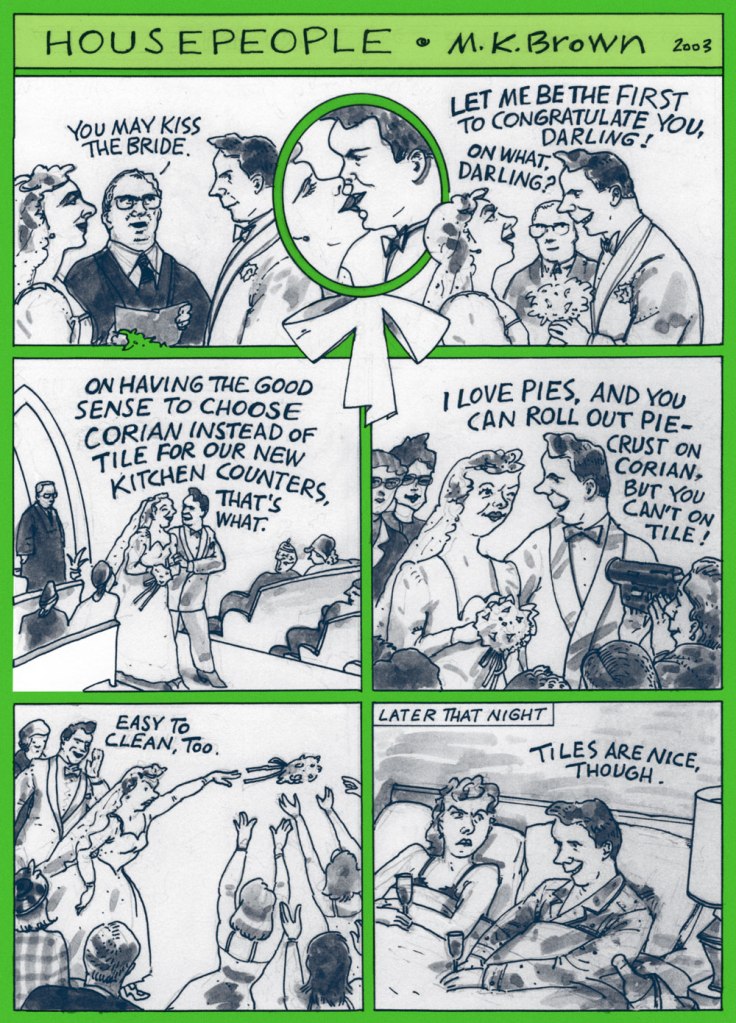 Brown is clearly a female cartoonist, in the sense of never eschewing topics that a doltish reader would expect a woman to talk about just because it’s a ‘female’ leitmotif. She can start with something mundane like a hostess organizing a party, put a surreal spin on it, pepper it with playful language, and end up with a concoction that’s devilishly acerbic, quite strange, and very funny. Bill Griffith put it well – she ‘makes the personal universal, makes the universal personal‘. The result seems quite polarising; it’s the sort of thing you instantly click with, or something so foreign that it’s unappealing. Is any of it dated, as I’ve seen some people suggest? Not in the slightest. Human relationships haven’t changed much over the years, though we like to pat ourselves on the back for being so much more evolved. Focusing on the fact that someone is wearing a suit with shoulder pads (which are, by the way, coming back into fashion) to decide it’s no longer relevant to modern life is daft.