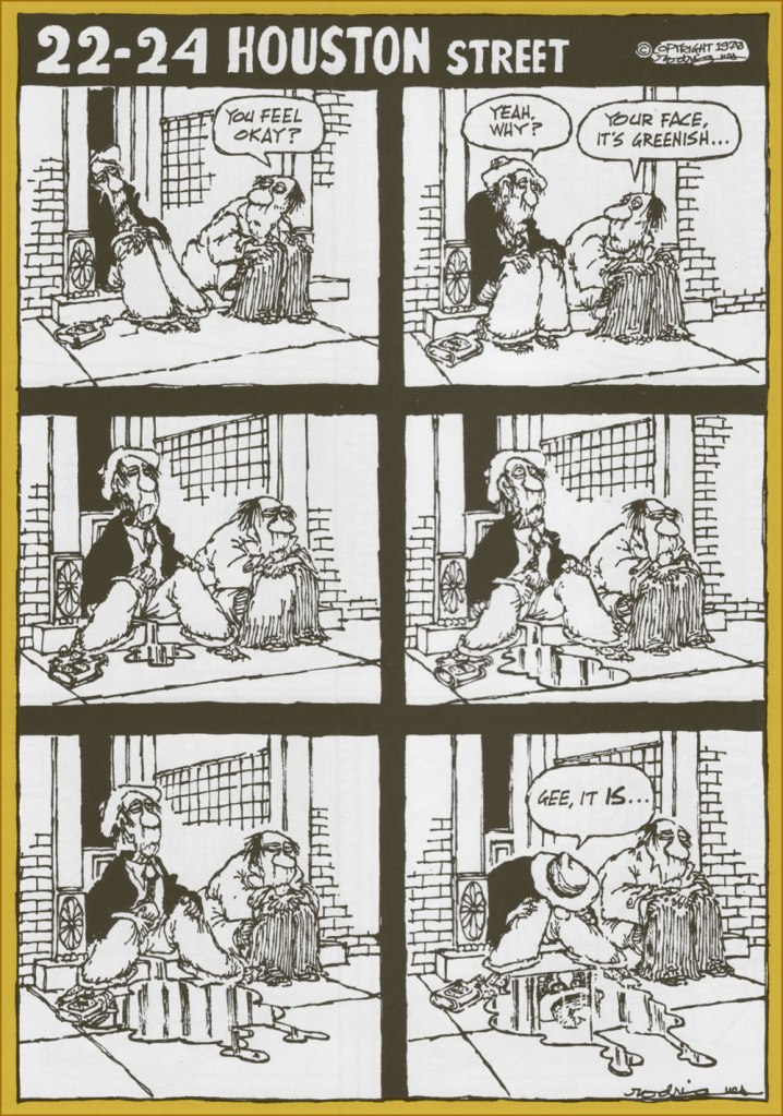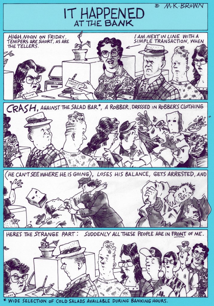Despite the scope of her oeuvre and her very recognizable style, she’s not nearly as well known as she deserves to be. Fantagraphics, coming, as usual, to the rescue, published a sort of best-of in 2014, titled Stranger Than Life: Cartoons and Comics 1970-2013. Interestingly, this collection did little to dispel the clearly purposefully cultivated mystique. Whereas usually one expects an introduction with the author’s birth date and a quick summary of their childhood and proclivities, in this case M.K. Brown remained firmly ensconced within her initials*** and shrouded in pleasant mystery.