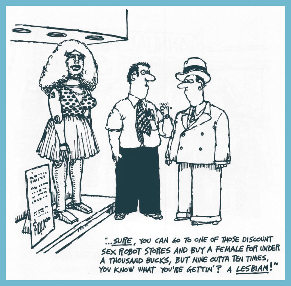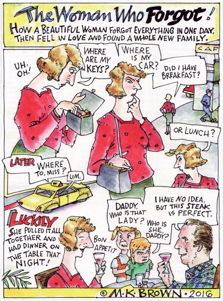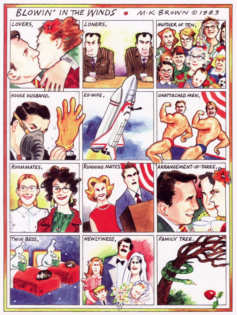 Not much is known about the personal life of the mysterious M. K. Brown*. From her official website, we know that she grew up in Connecticut and New Brunswick, but that’s pretty much it. On the other hand, details from her long and prolific career abound**: she was a mainstay at the National Lampoon Magazine between 1972 and 1981 (including the regular series Aunt Mary’s Kitchen); a frequent contributor to various magazines, most notably Playboy, The New Yorker, and Mother Jones; creator of the animated series Dr. N!Godatu, which ran in the Tracey Ullman Show in 1987 for a mere 6 episodes (two more remain unaired) until it was supplanted by the Simpsons; illustrator of children’s books… and so it goes.