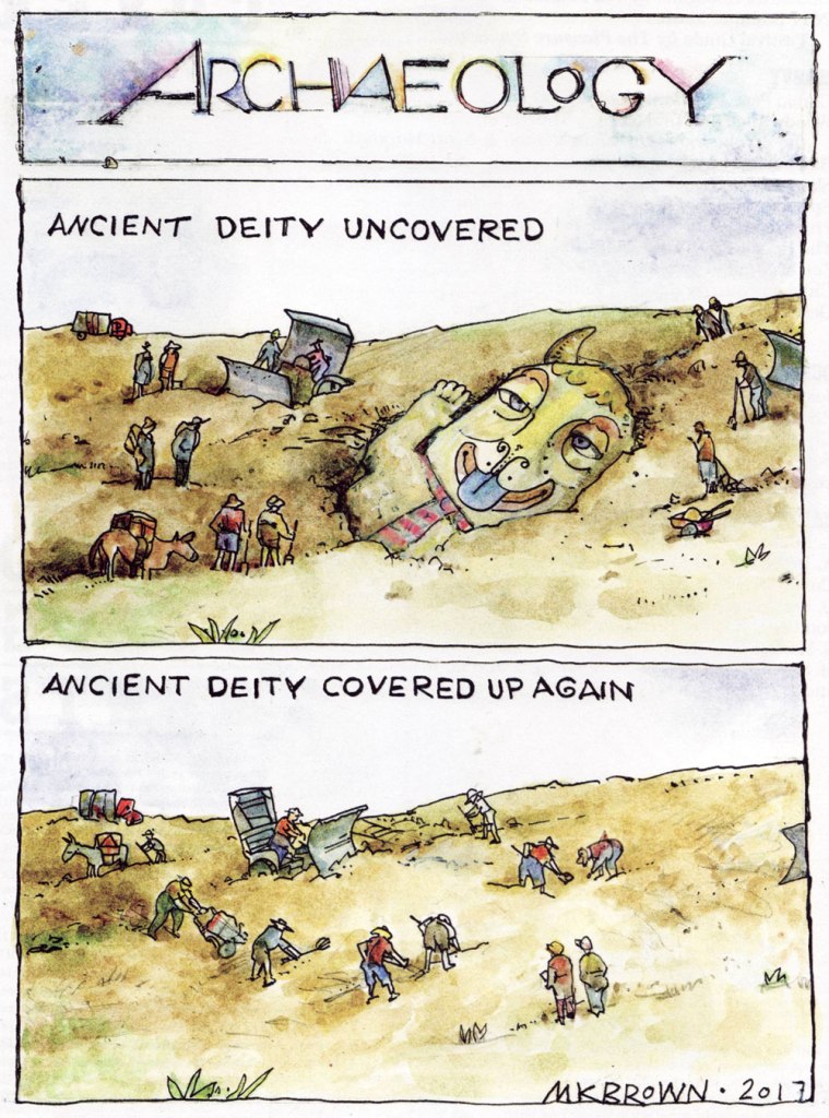 The American Bystander conducted a fun, hour-long podcast with Brown in 2016. I am a visually oriented person, and have immense trouble sitting through a podcast, so I had to tell myself I had to listen for the sake of this blog post – I hope you appreciate this sacrifice. It was a pleasure to listen to Brown, who sounds exactly like I pictured it, though I was somewhat underwhelmed by some of the softball questions she was asked – questions interviewer (in this case, Gil Roth) usually asks of a cartoonist, ‘what were your art influences?’, ‘what explains your sense of humour?’ I believe this has more to do with me than with the actual interview – I by far prefer to glean some understanding of a person through their work, as opposed to discussions about their work (which is a slightly strange stance for a blog writer). There is, however, a fun anecdote about how she used to put up her paintings on the walls to work on them, and had to cover her sleeping nocturnal husband and the bed he was on with plastic not to splatter him with paint. Brown also mentions that she has a stash of drawings which she could never get published because they’re too risqué – oh, how we would all love to see those! Click here if you’d care to listen to it!