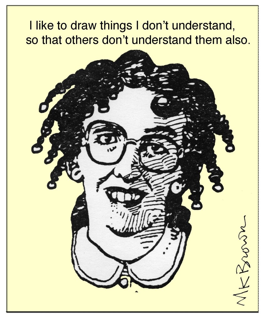* I will mention straight away that she was married to equally eccentric cartoonist B. Kliban (another WOT favourite), not because a woman’s worth is in being a wife to her husband, but because ‘M.K. Brown married to B. Kliban’ has a harmonious ring to it.