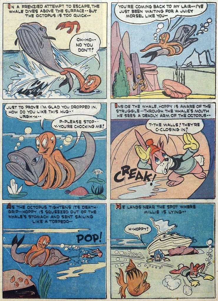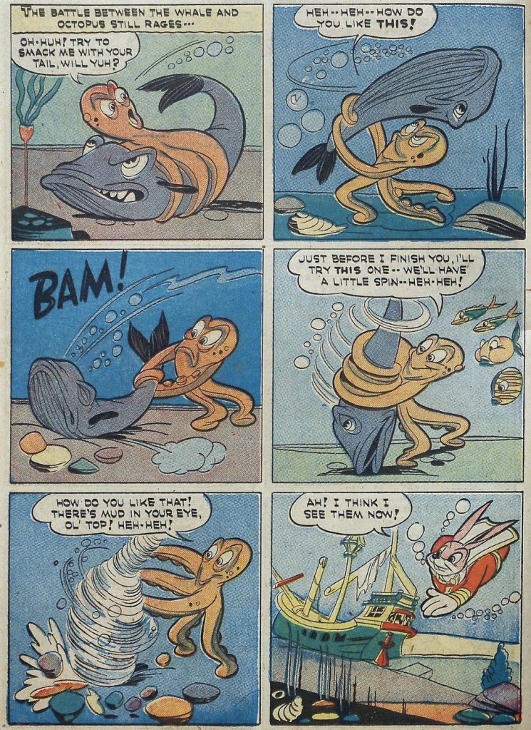 I promised some bunny action – but not the kind that springs immediately to mind! Enjoy this 2-page tentacled tussle in this Hoppy the Marvel Bunny story illustrated by Chad Grothkopf and published in Fawcett’s Funny Animals no. 5 (April 7th, 1943, Fawcett).