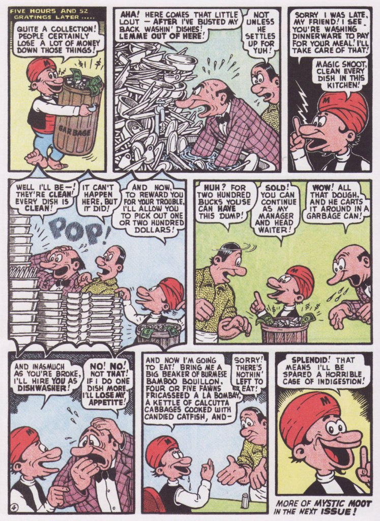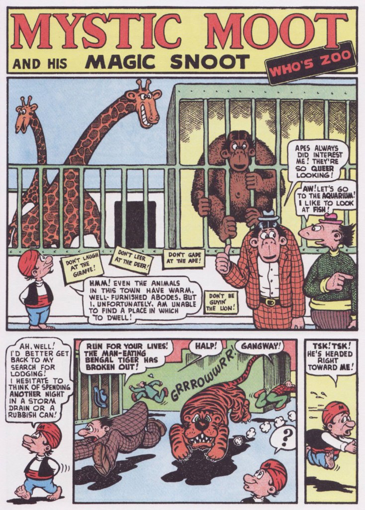 From this thrilling new assemblage, I’ve picked a pair of short samples, both featuring my favourite Wolverton protagonist, Mystic Moot (and his Magic Snoot). Sadowski informs us that: