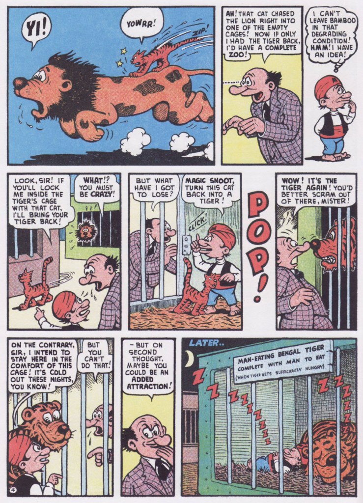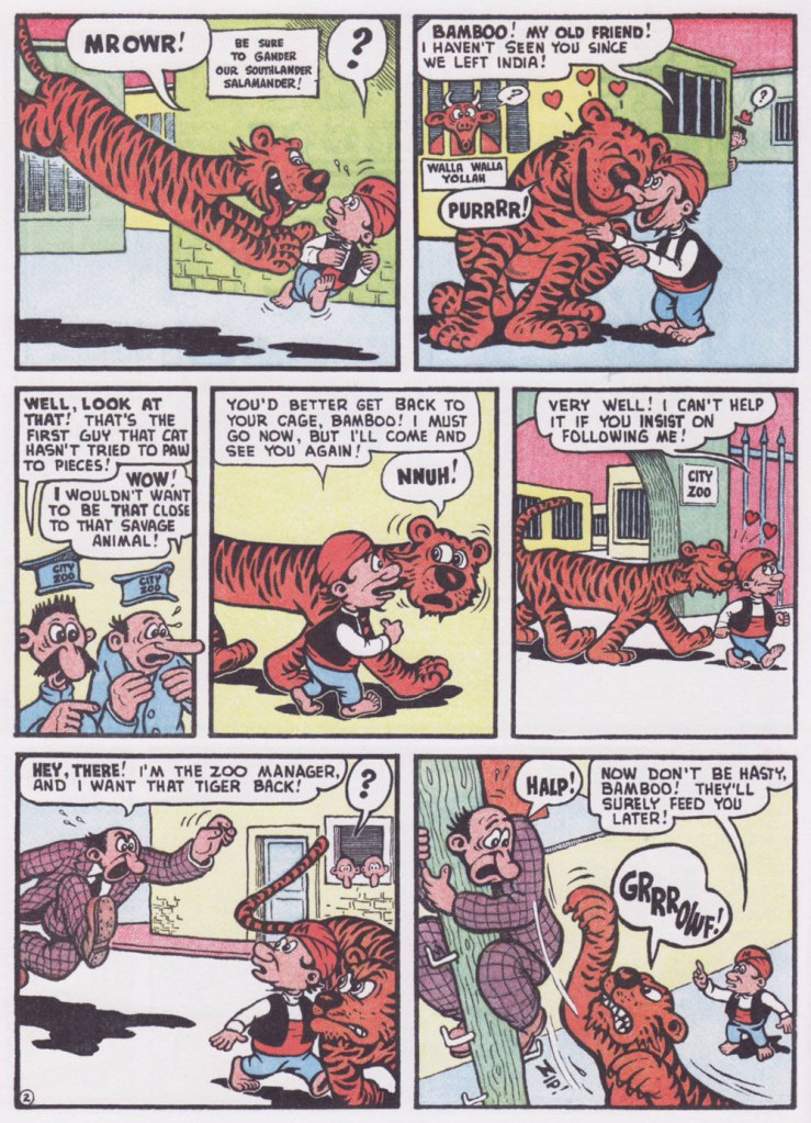 My favourite of Otto Binder/C.C. Beck’s characters – Tawky Tawny, the well-mannered, reasonable, tweed-wearing tiger. Sweet Tawny first appeared in Captain Marvel Adventures #79 (December 1947), as a talking tiger who longed for a life as a normal, suit-wearing, polite member of society. He also really likes ice cream. This panel is from “Mr. Tawny’s Personality Peril”, a story by the Binder and Beck team, published in Captain Marvel Adventures #115 (December 1950).