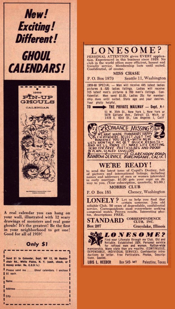 A sample of the classifieds. Do I, er… detect a certain pattern? One clear advantage of the Pin-Up Ghouls calendar is that you can reuse it next in 2026, so keep an eye out for gently-used copies!