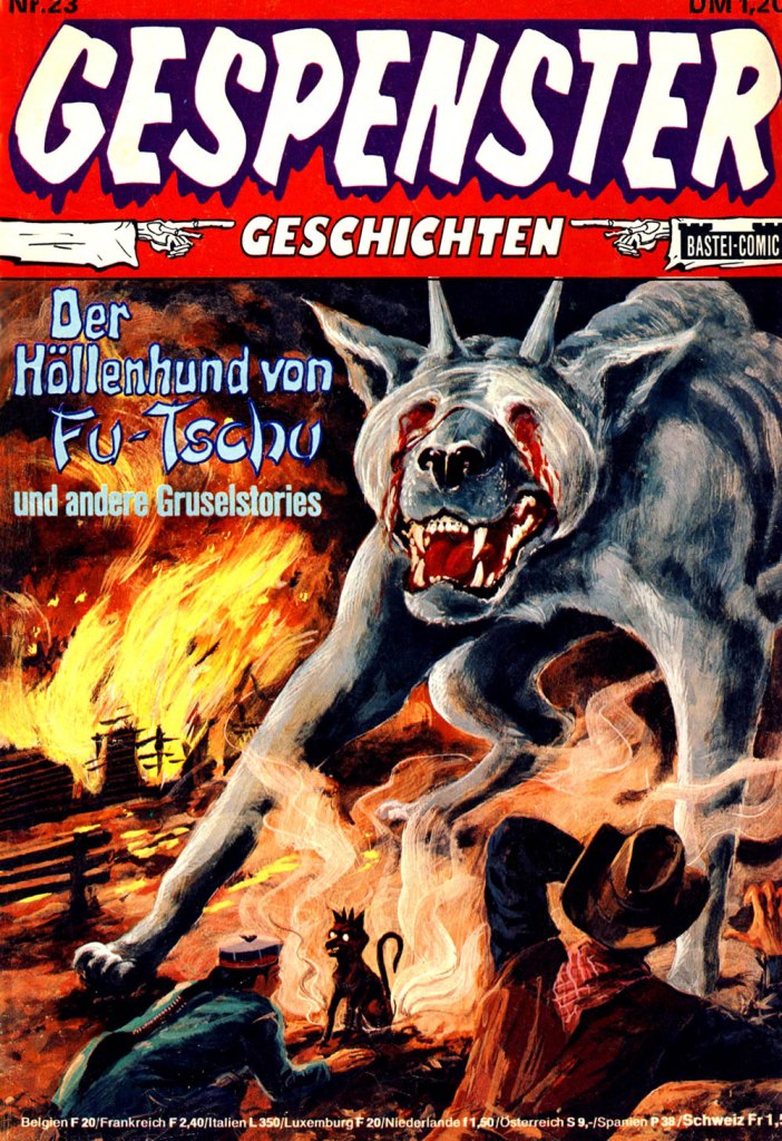 Gespenster Geschichten no. 23: Der Höllenhund von Fu-Tschu (The Hellhound from Fu-Tschu), 1974. This cover is equal parts disturbing and puzzling, with a creepy bear-dog with bleeding sockets and the little demonic effigy that is somehow simultaneously cute and clearly evil.
