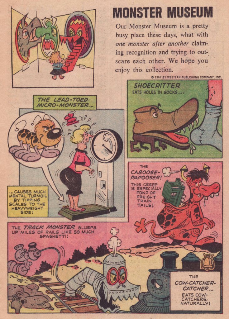 One pleasingly off-kilter feature that appeared in the publisher’s small line of ‘spooky’ titles (Boris Karloff Tales of Mystery, The Twilight Zone and Ripley’s Believe It or Not) was “Monster Museum”. Though it seemingly couldn’t settle on an approach or tone, it was witty, lightweight fun. Here are most of the highlights.
