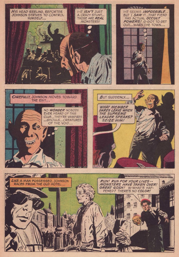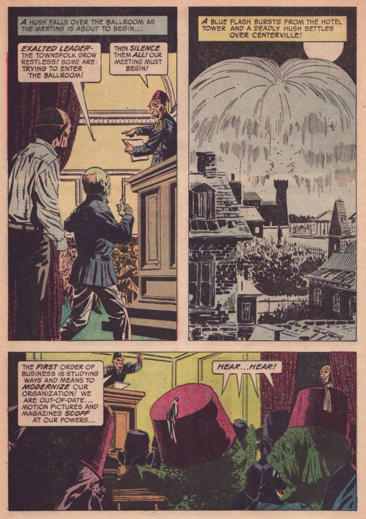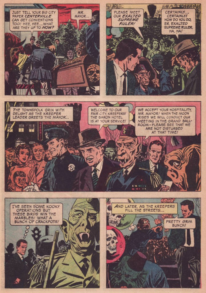 Here’s my favourite of the lot, a tale published in Boris Karloff Tales of Mystery no. 12 (Dec. 1965, Gold Key). I’ve probably tipped my hand with my choice of quote: “The Convention” reminds me of Mr. Bradbury’s timeless The Homecoming [ read it here ].