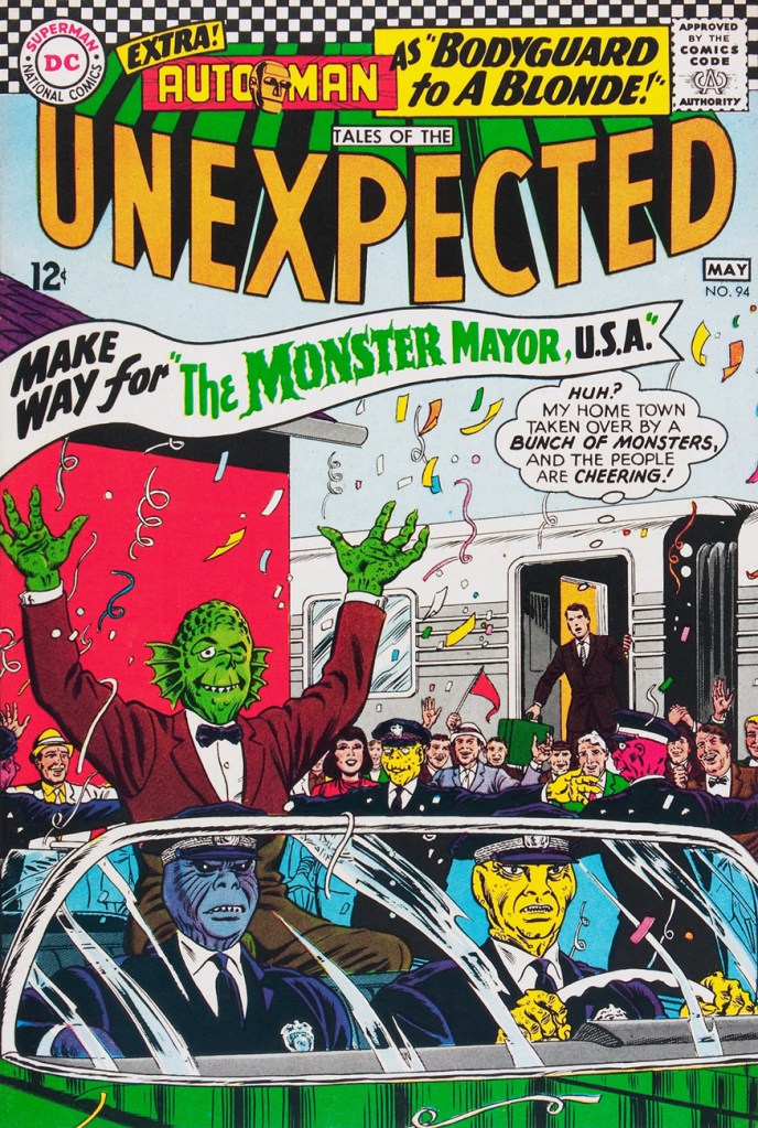 « Our appearance makes little difference… so long as we are in power! » Evidently, political cynicism is nothing new. DC’s Jack Schiff-edited “mystery” titles were a lot of utter bushwah, but oddly mesmerising if one surrendered to the spirit of the thing. And to a Bernard Baily and Mort Meskin fan, they offered a pretty sweet cornucopia. “The Monster Mayor, U.S.A.” is one of a series of oddball situations triggered by an invisible (but green!) sentient cloud from outer space called “The Green Glob“. The sort-of series ran in TOTU 85 to 98, then 100, 102 and 103. Weirdies!