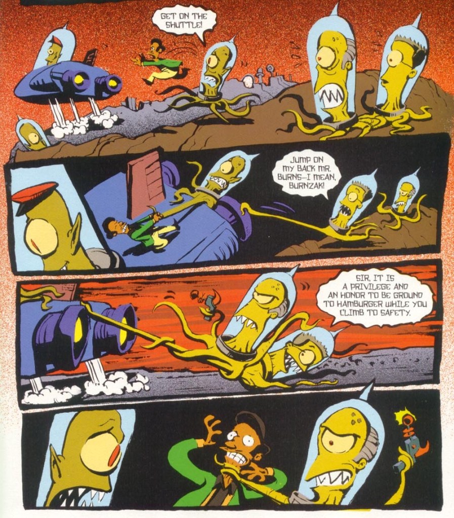 Apu on Rigel 7, written and illustrated by Doug TenNapel, was published in Treehouse of Horror no. 5 (September 1999). I’d like to say a few words about TenNapel, here: my first encounter with his sense of humour was through the video game Earthworm Jim, which has retained a special place in my heart though I last played it some twenty years ago. I’ve read some of his graphic novels, and though I was mostly underwhelmed, TenNapel’s wild imagination was a pleasure. Having said that, his politics and beliefs have led him to gradually transforming into a judgmental asshole, which is completely at odds with the empathy he displays in his comics.