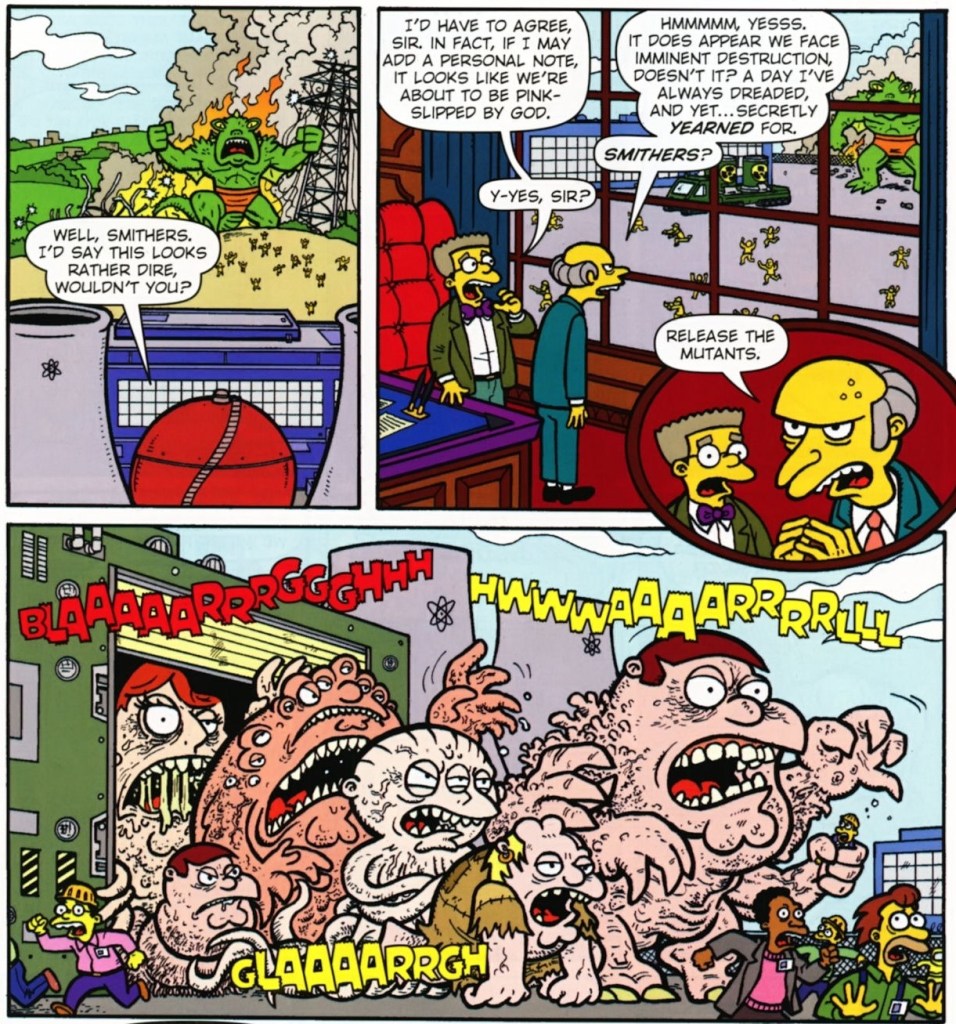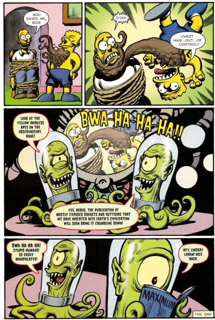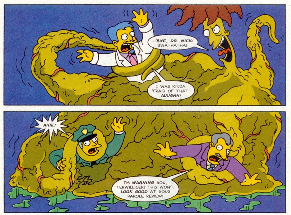 Skipping over a few tentacle-less issues (for shame!), we arrive at number five, in which Mr Burns and Smithers, having been turned into Rigellians, demonstrate a proficient use of tentacles for their god-intended purpose, namely grabbing and choking.