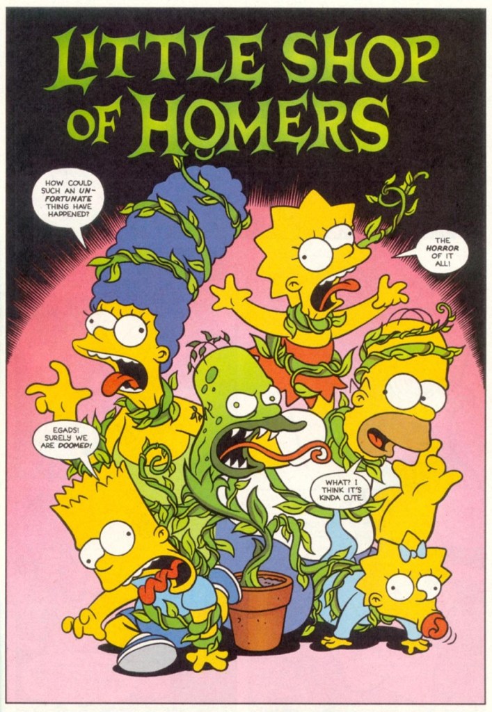 Little Shop of Homers, scripted by Mike Allred and pencilled by Luis Escobar and Bill Morrison, was published in Treehouse of Horror no. 1 (October 1995).