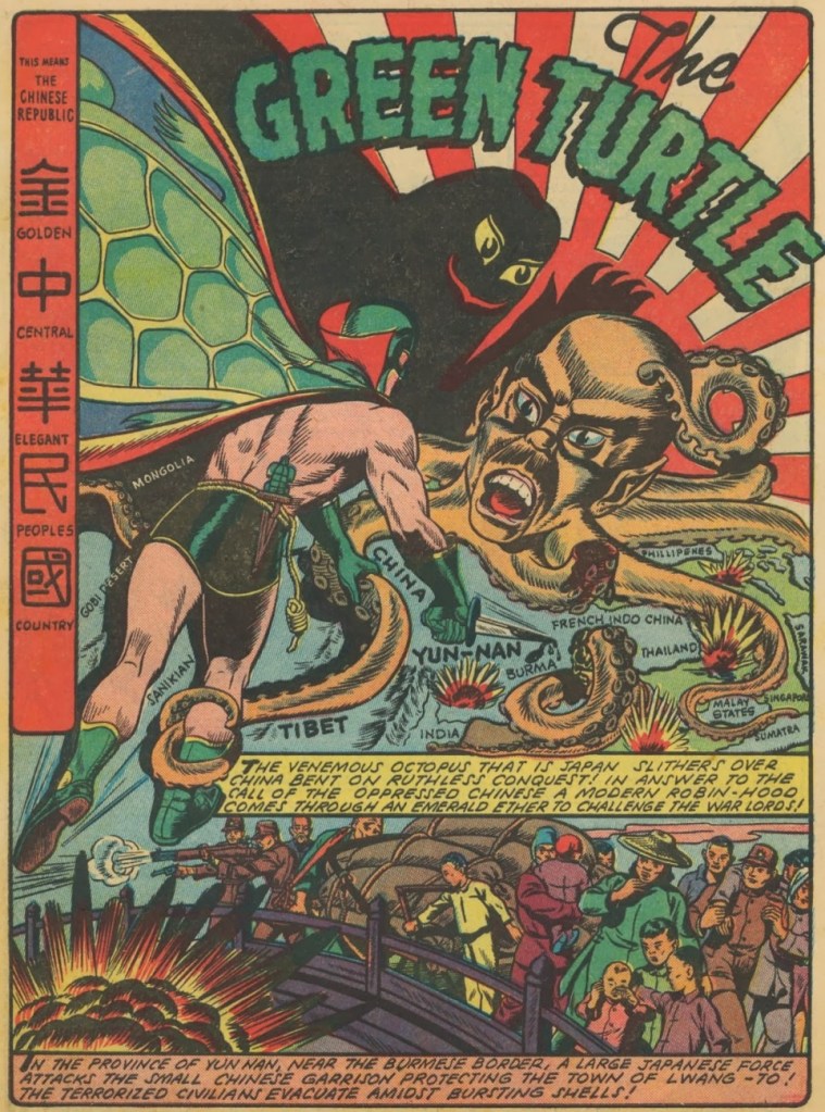 The next superhero (technically with no super powers, but managing beautifully all the same thanks to his lightning-fast reflexes and superior fighting skill) is my personal favourite Green Turtle, a Chinese superhero who fought against Japanese invaders in WWII. Unfortunately, the publisher wouldn’t let creator and artist Chu Fook Hing make his creation obviously Chinese, so the Green Turtle was never seen without a mask. It’s okay, we can read between the lines!