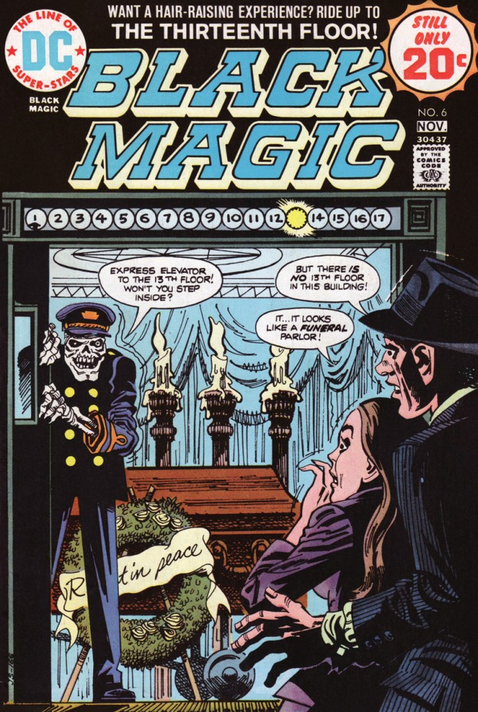 A Jack Kirby cover scene gets winningly recast for the 70s by Jerry Grandenetti, himself a contributor to the original series. This is Black Magic no. 6 (Oct.-Nov. 1974, DC).